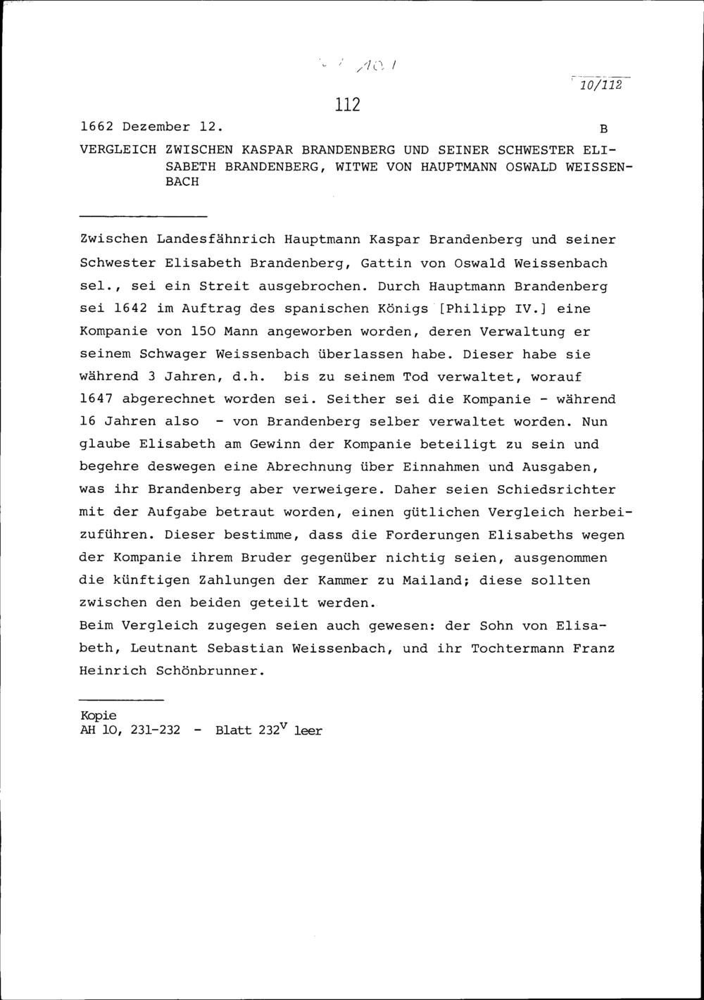 Vergleich zwischen Kaspar Brandenberg und seiner Schwester Elisabeth Brandenberg, Witwe von Oswald Weissenbach, Hauptmann