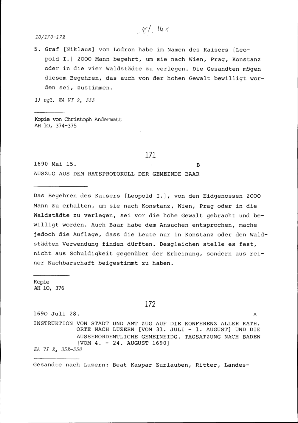 Instruktion von Stadt und Amt Zug auf die Konferenz aller Katholischen Orte in Luzern vom 31. Juli bis 1. August und die ausserordentliche Tagsatzung in Baden vom 4. bis 24. August 1690