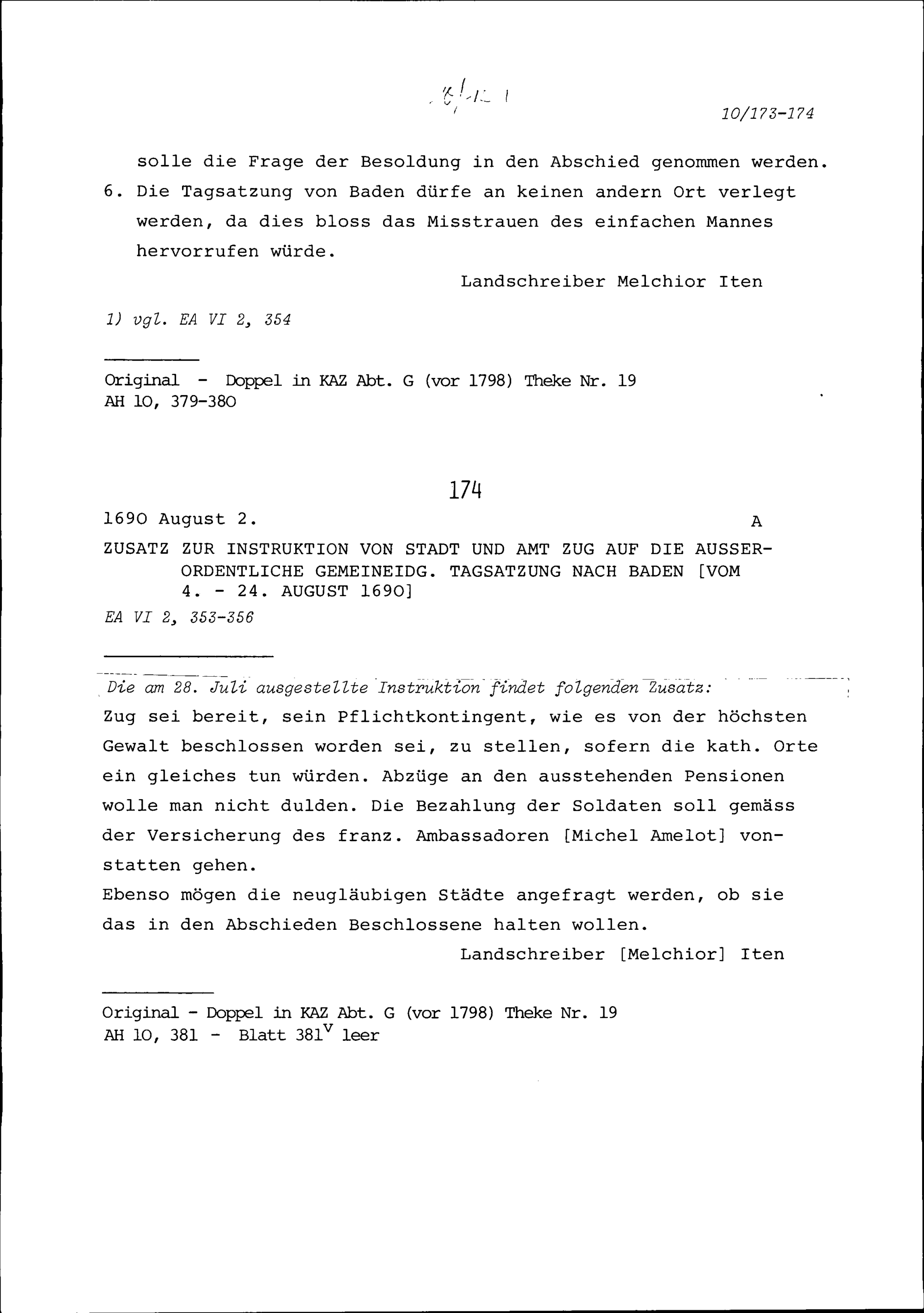 Zusatz zur Instruktion von Stadt und Amt Zug auf die ausserordentliche Tagsatzung in Baden vom 4. bis 24. August 1690