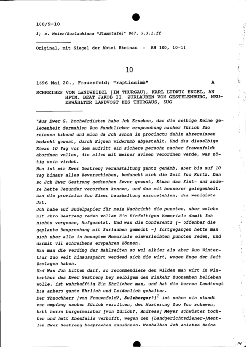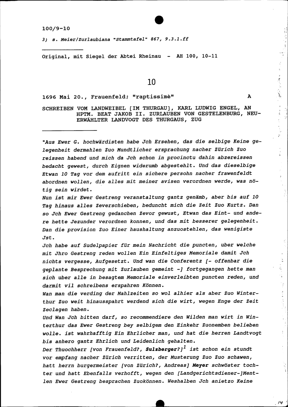 Schreiben von Karl Ludwig Engel, Landweibel im Thurgau, an Beat Jakob II. Zurlauben, Hauptmann und Landvogt des Thurgaus, Zug