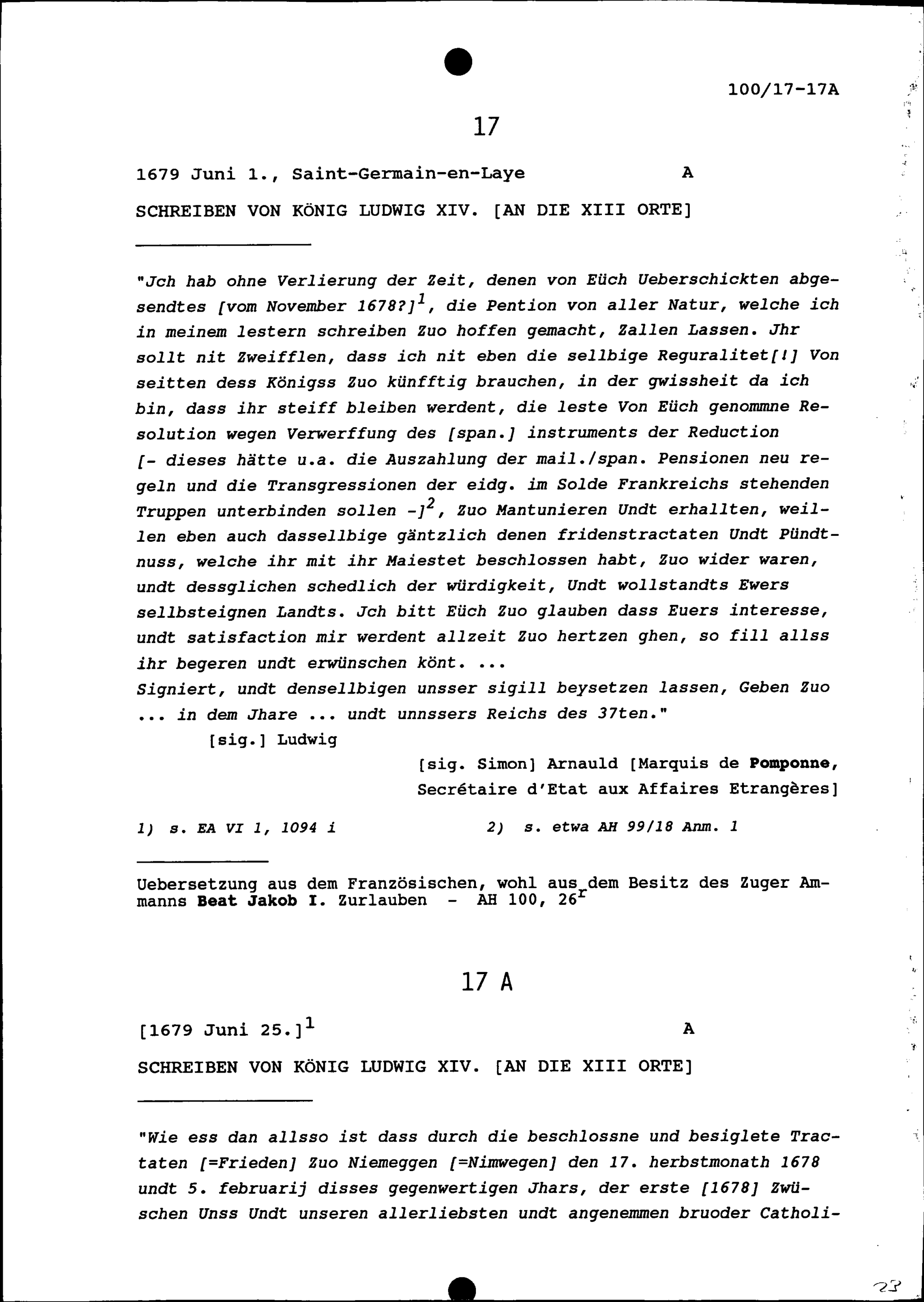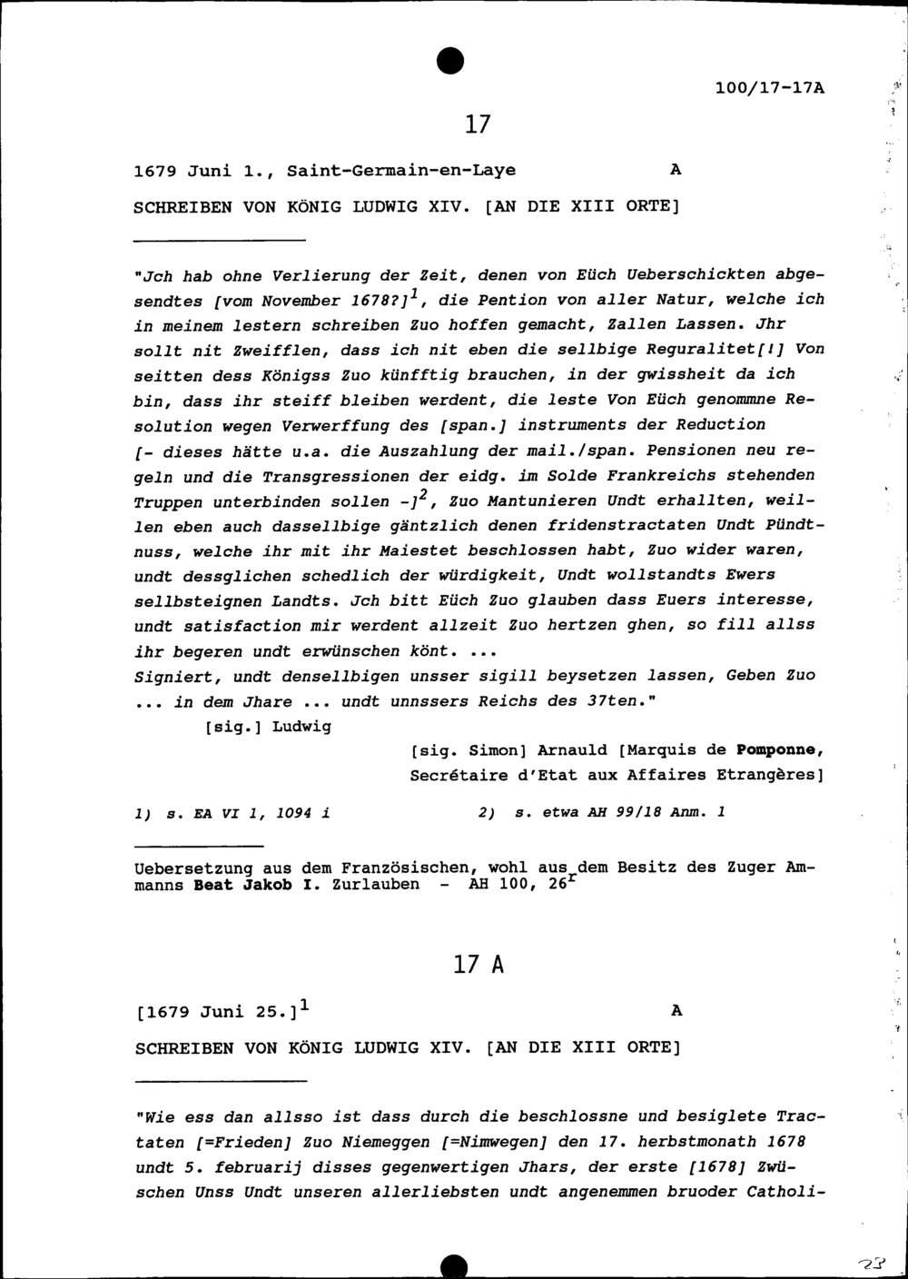 Schreiben von Ludwig XIV., König von Frankreich, an die Dreizehn Orte