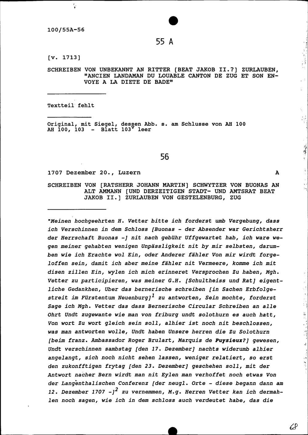 Schreiben von Unbekannt an Beat Jakob II. Zurlauben, Altlandammann, Baden