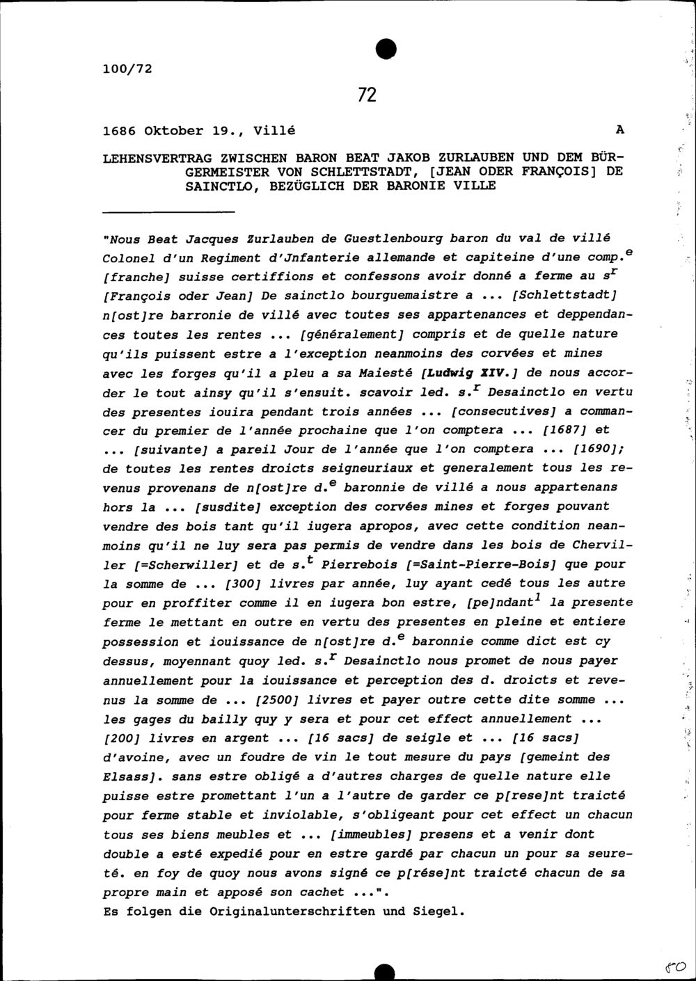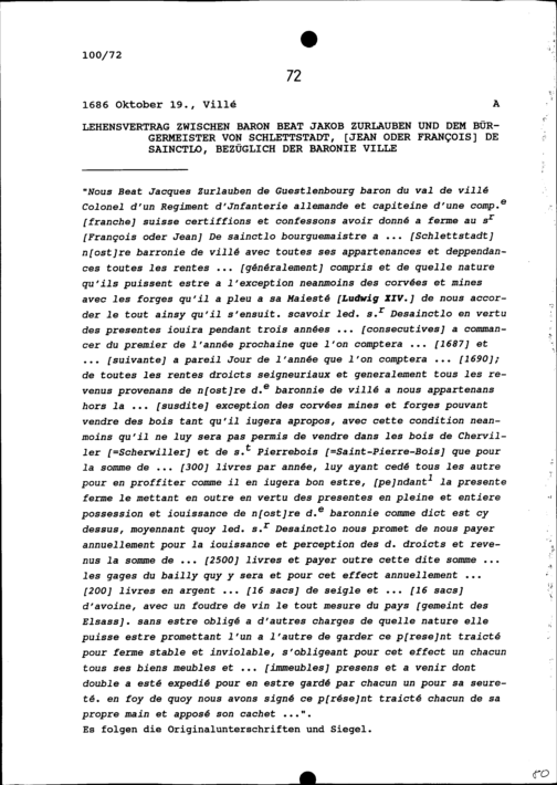 Lehensvertrag zwischen Beat Jakob Zurlauben und dem Bürgermeister von Schlettstadt, Jean oder François de Sainctlo, bezüglich der Baronie Ville
