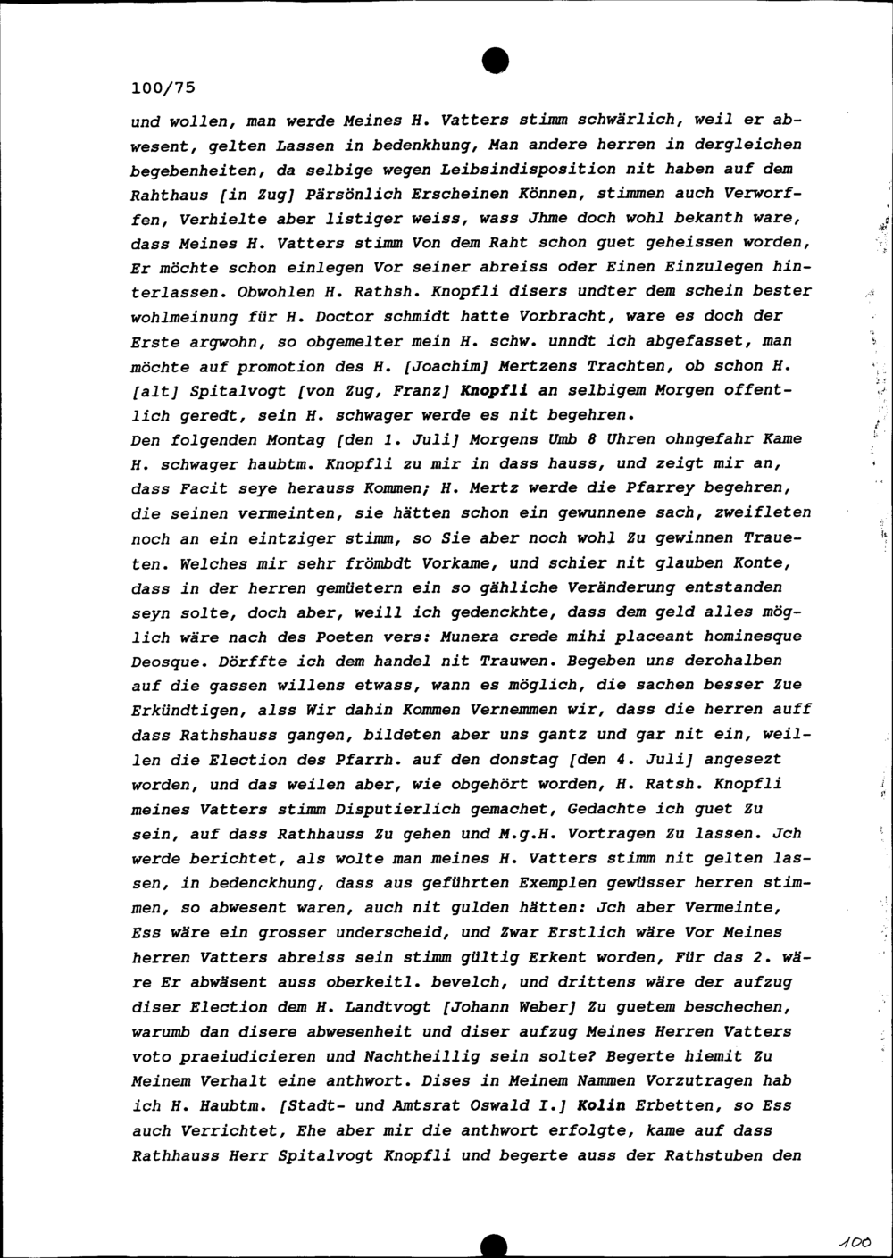 Bericht über die Wahl von Johann Jakob Schmid als Pfarrherr von Zug, aufgezeichnet von Johann Jakob Brandenberg, Statthalter von Stadt und Amt Zug