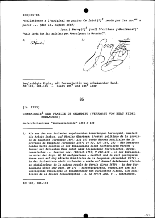 Genealogie der Familie de Chandieu, verfasst von Beat Fidel Zurlauben