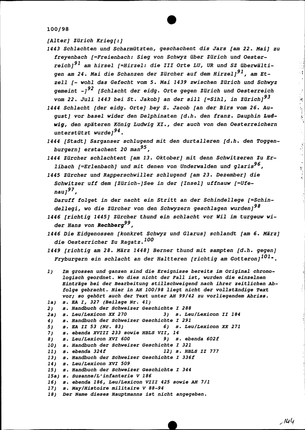 Historischer Abriss über die Fremden Dienste der Eidgenössischen Orte, über Schlachten und Gefechte in der Eidgenossenschaft, den Eintritt der einzelnen Orte ins Bündnis sowie über verschiedene Geschehnisse in Zürich