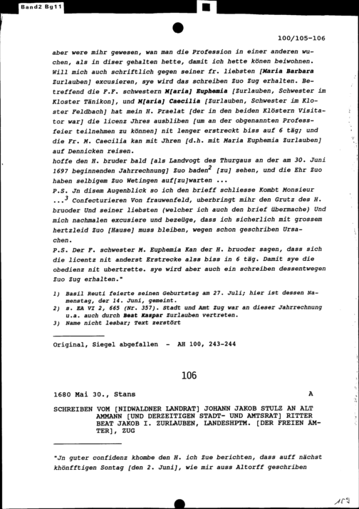 Schreiben von Johann Jakob Stulz, Nidwaldner Landrat, an Beat Jakob I. Zurlauben, Altammann, Stadt- und Amtrat und Landeshauptmann der Freien Ämter, Zug