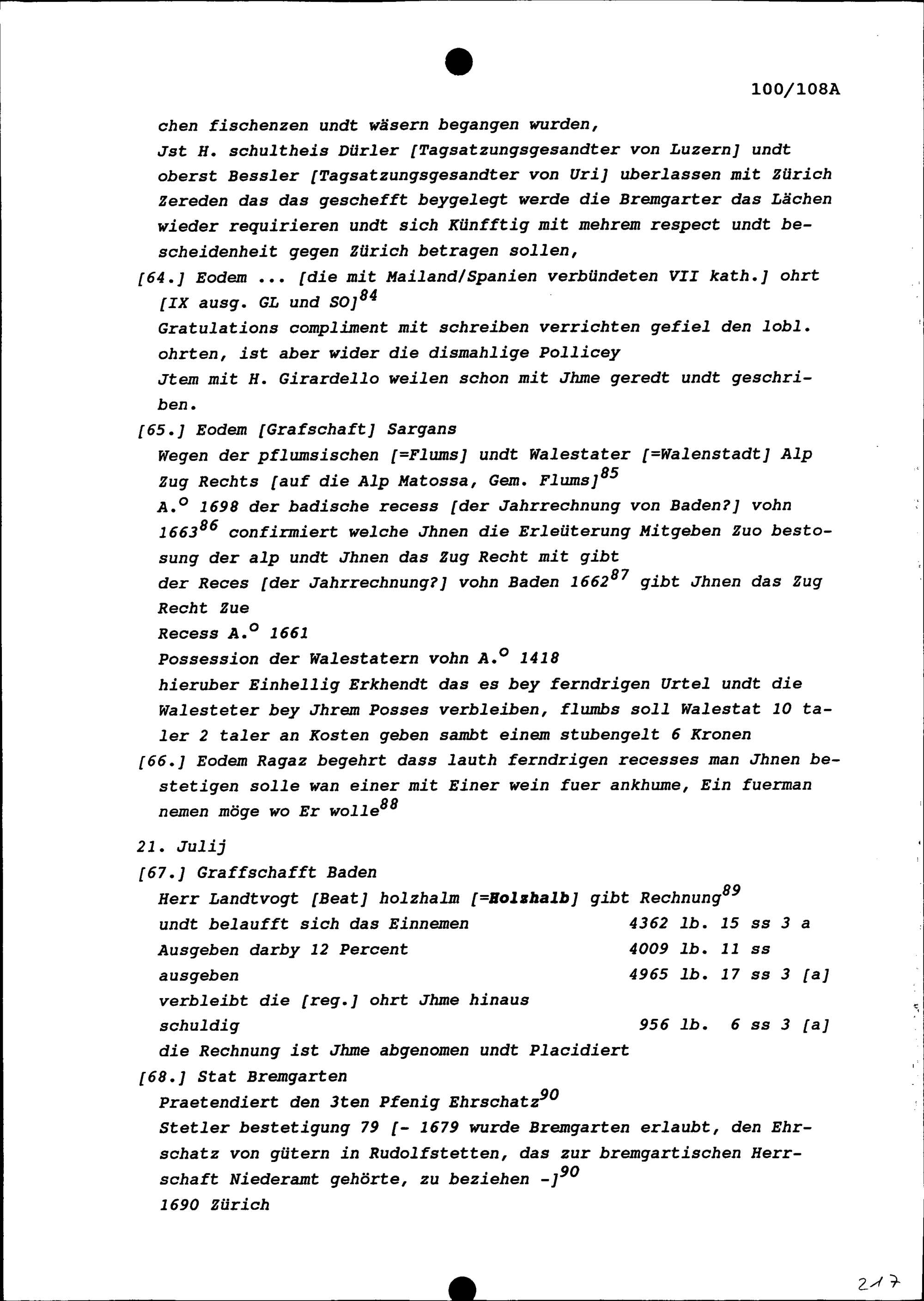 Notiz von Beat Kaspar Zurlauben, Tagsatzungsgesandter von Stadt und Amt Zug, über die Jahrrechnung vom 5. bis 29. Juli 1699 in Baden