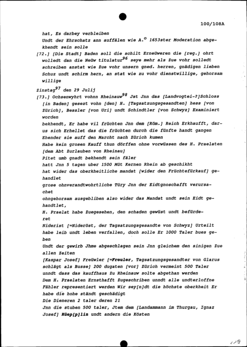 Notiz von Beat Kaspar Zurlauben, Tagsatzungsgesandter von Stadt und Amt Zug, über die Jahrrechnung vom 5. bis 29. Juli 1699 in Baden