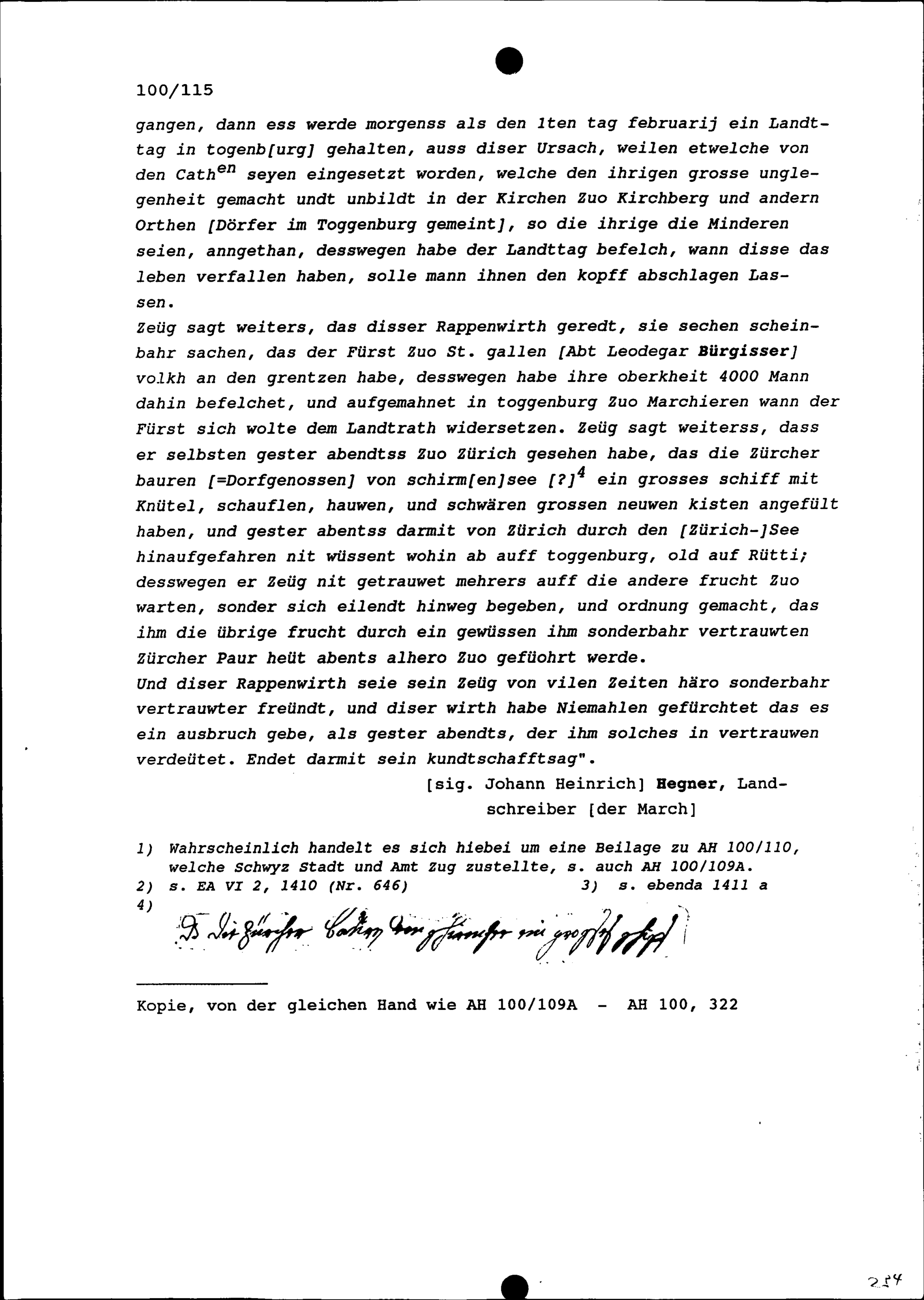 Kundschaftsaussagen von Franz Hegner, Statthalter der March, aufgenommen in Anwesenheit von Heinrich Anton Reding, Schwyzer Landeshauptmann und Oberstwachtmeister