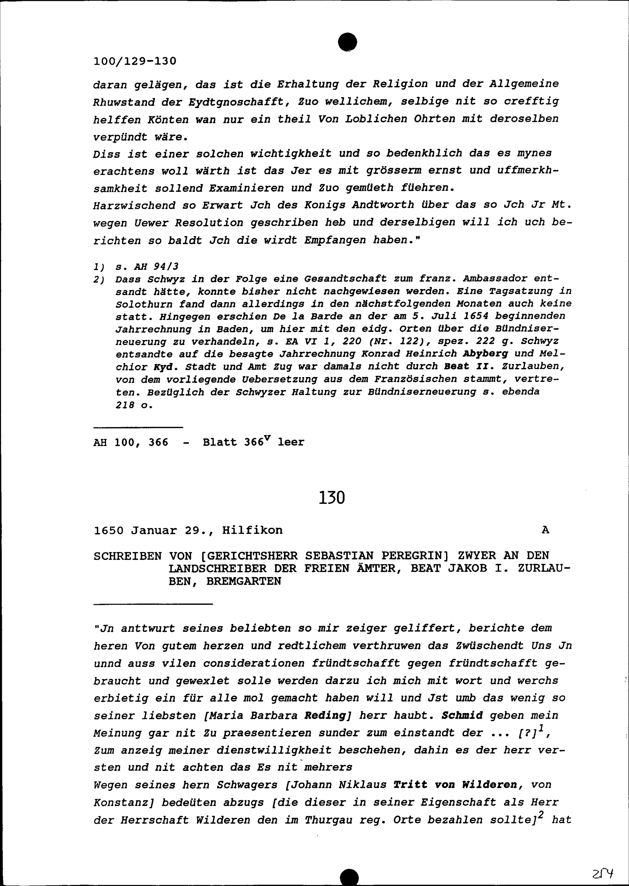Schreiben von Sebastian Peregrin Zwyer, Gerichtsherr, an Beat Jakob I. Zurlauben, Landschreiber der Freien Ämter, Bremgarten