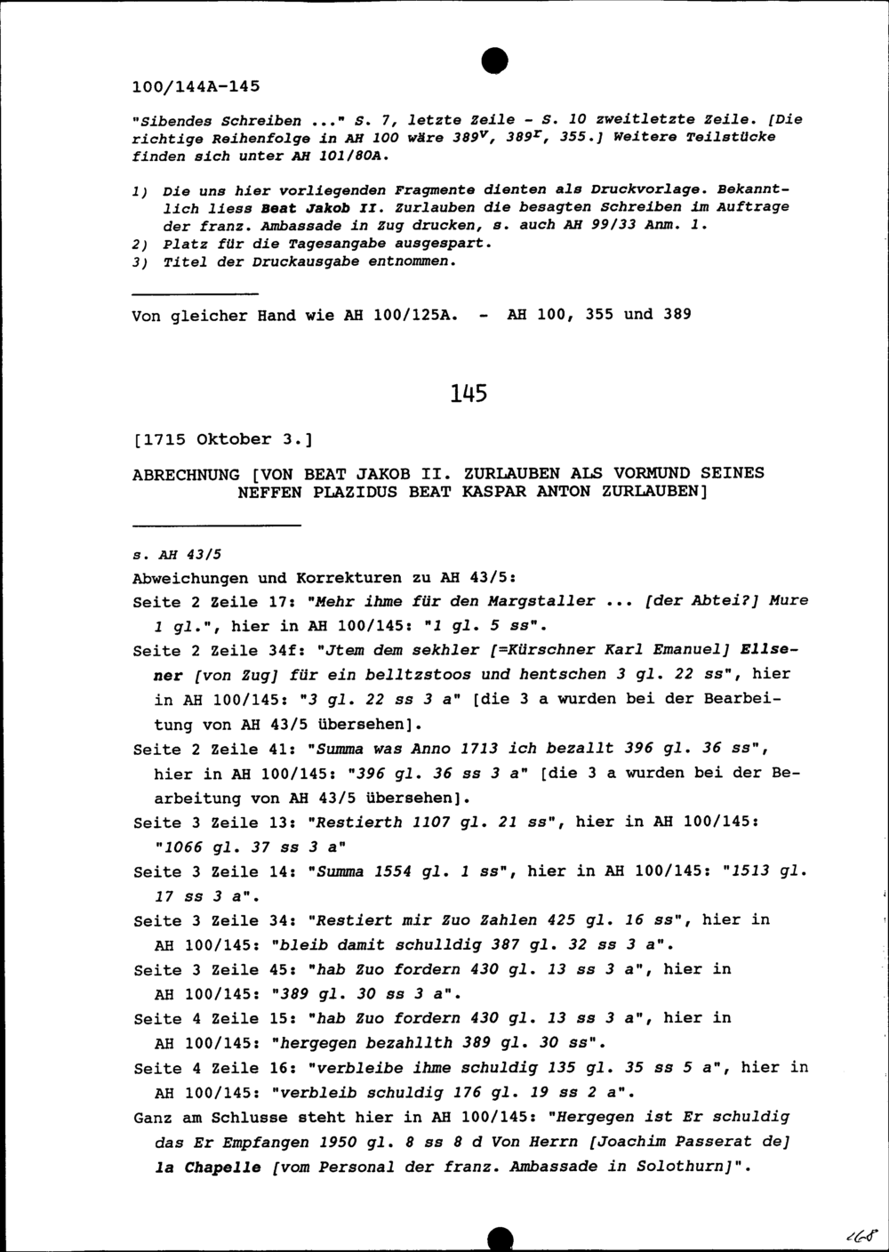 Abrechnung von Beat Jakob II. Zurlauben als Vormund von Plazidus Beat Kaspar Anton Zurlauben, seinem Neffen