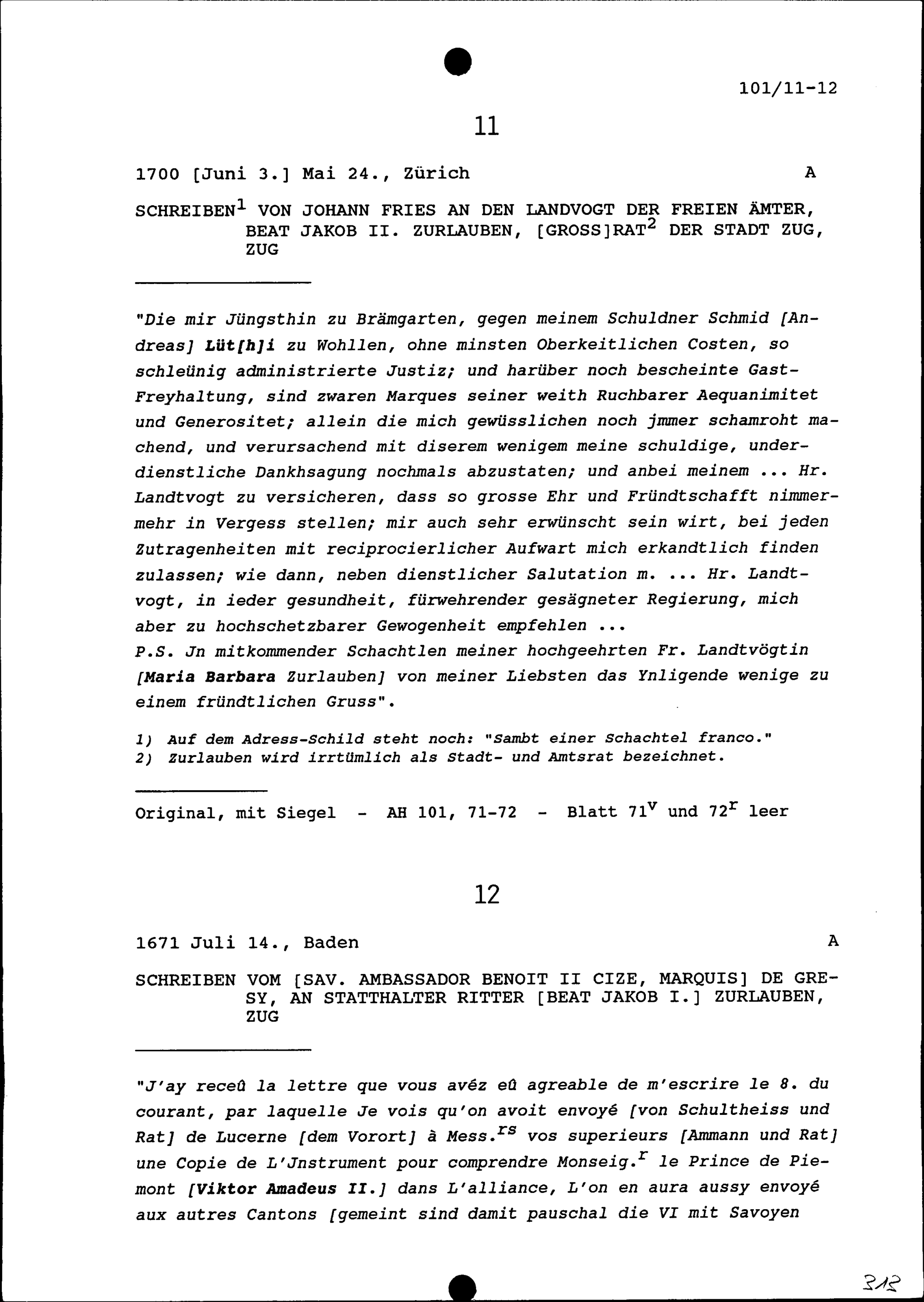 Schreiben von Johann Fries an Beat Jakob II. Zurlauben, Landvogt der Freien Ämter und Grossrat der Stadt Zug, Zug