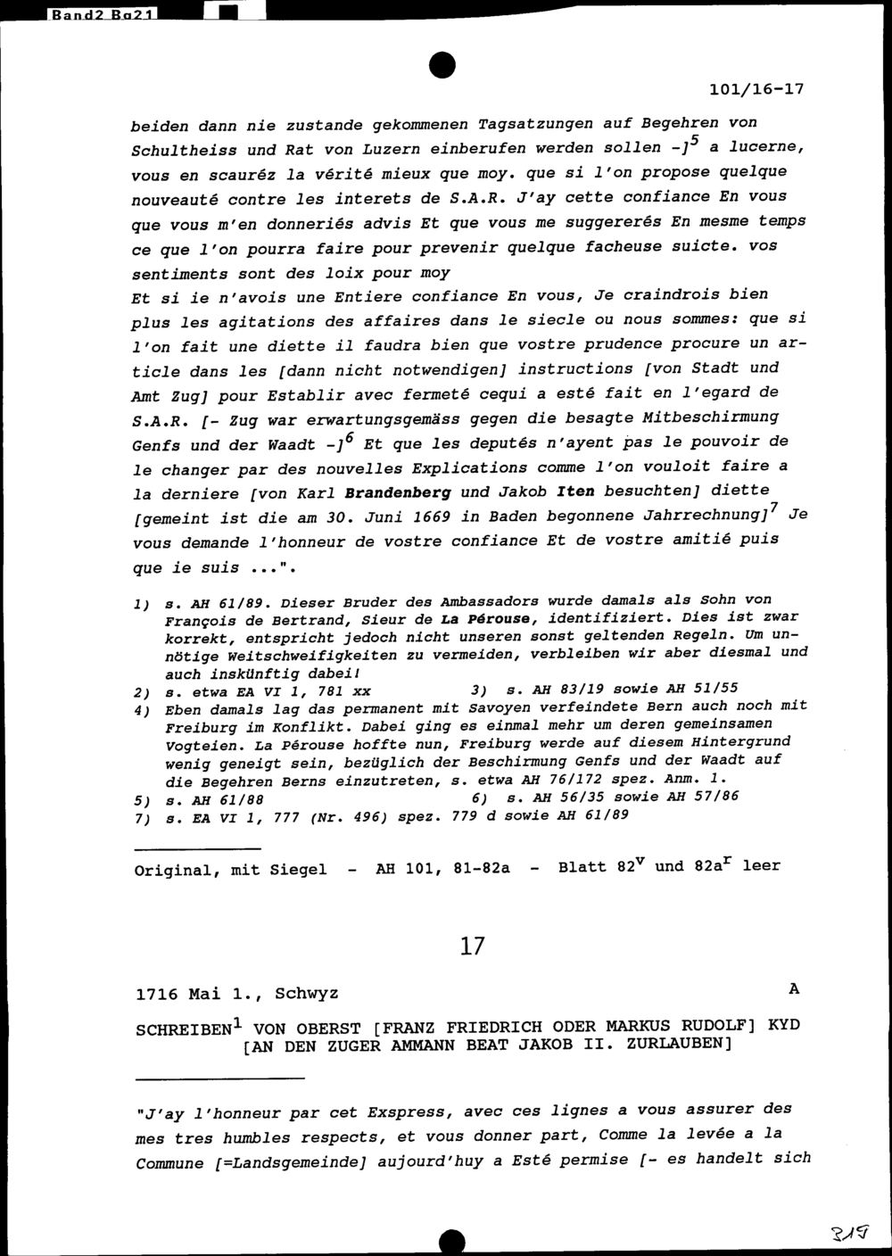 Schreiben von Franz Friedrich Kyd oder Markus Rudolf Kyd, Oberst, an Beat Jakob II. Zurlauben, Ammann