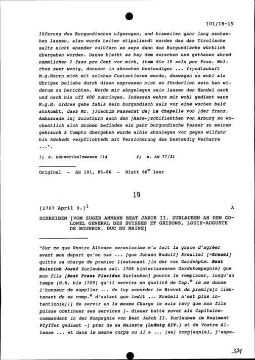 Schreiben von Beat Jakob II. Zurlauben, Ammann Zug, an Louis-Auguste de Bourbon, Duc du Maine, Kommandant des Regiments der Schweizer und Bündner Garden