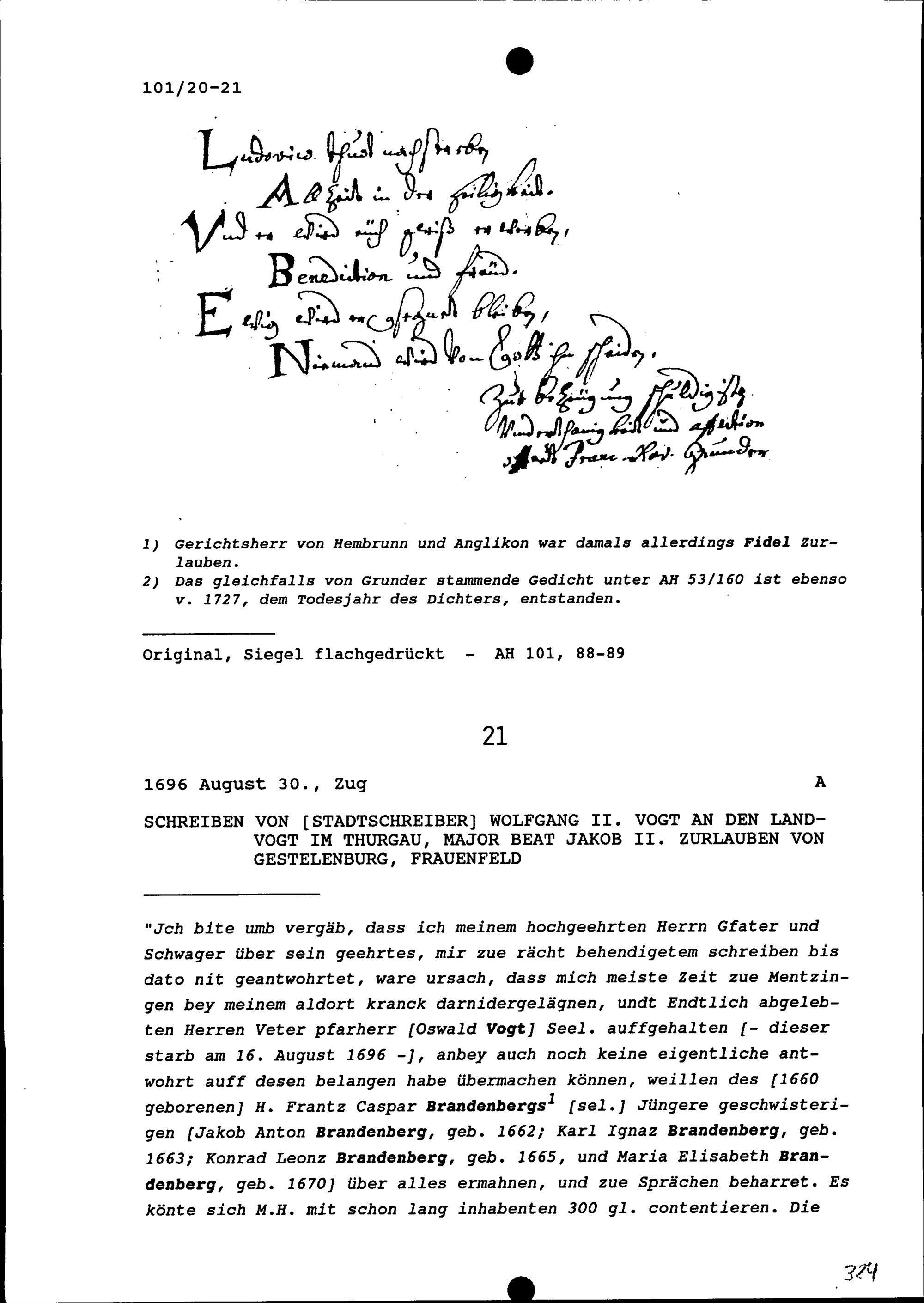 Schreiben von Wolfgang II. Vogt, Stadtschreiber, an Beat Jakob II. Zurlauben, Landvogt...