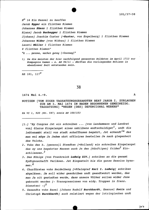 Notiz von Beat Jakob I. Zurlauben, Zuger Tagsatzungsgesandter, zur am 3. Mai 1674...