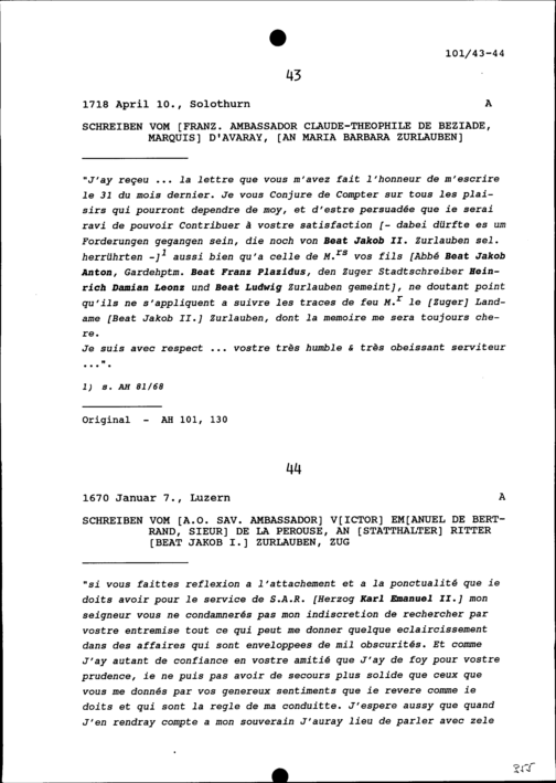 Schreiben von Claude-Théophile de Béziade, Marquis d'Avaray, Ambassador von Frankreich, an Maria Barbara Zurlauben