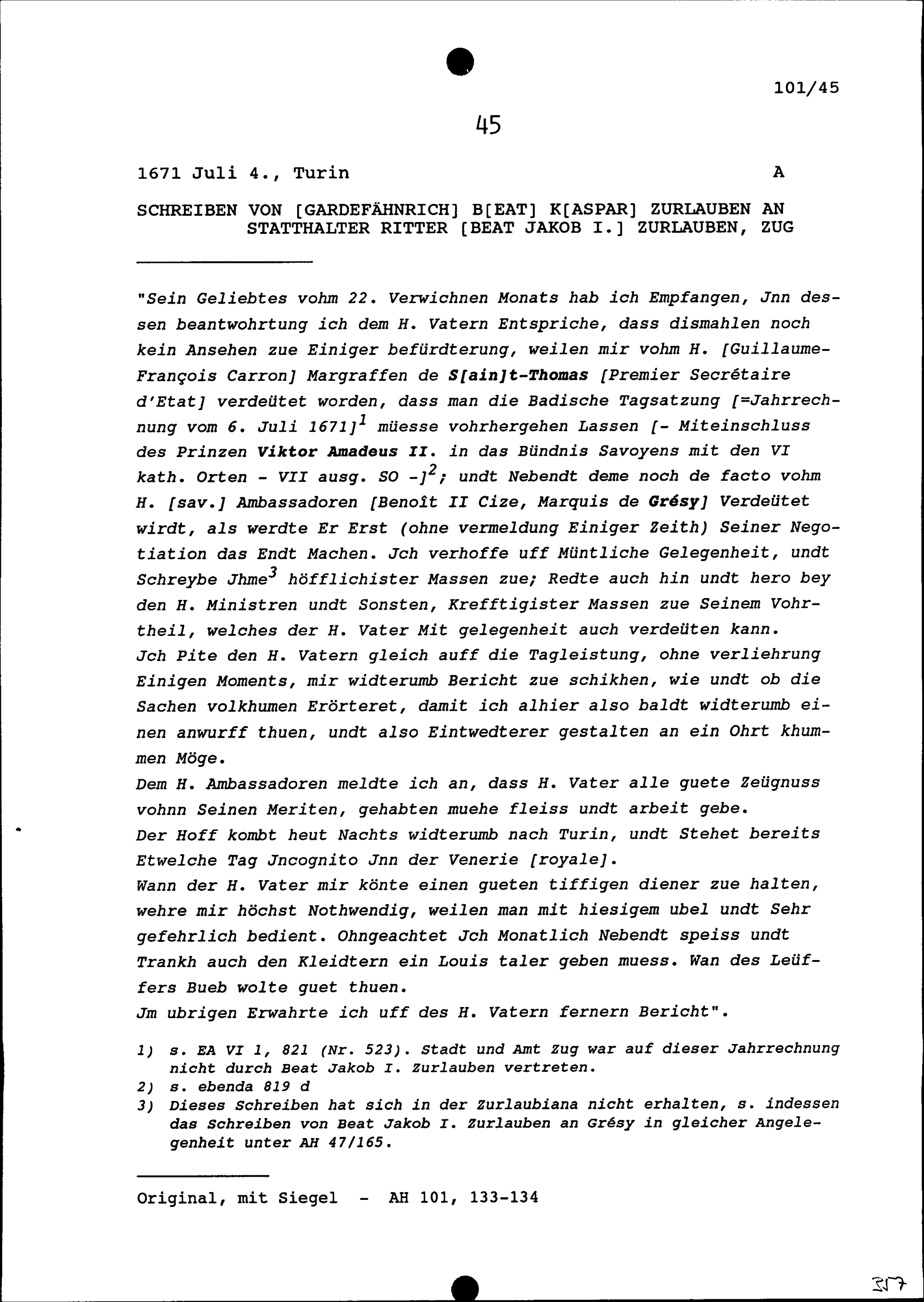 Schreiben von Beat Kaspar Zurlauben an Beat Jakob I. Zurlauben, Gardefähnrich und Statthalter, Zug