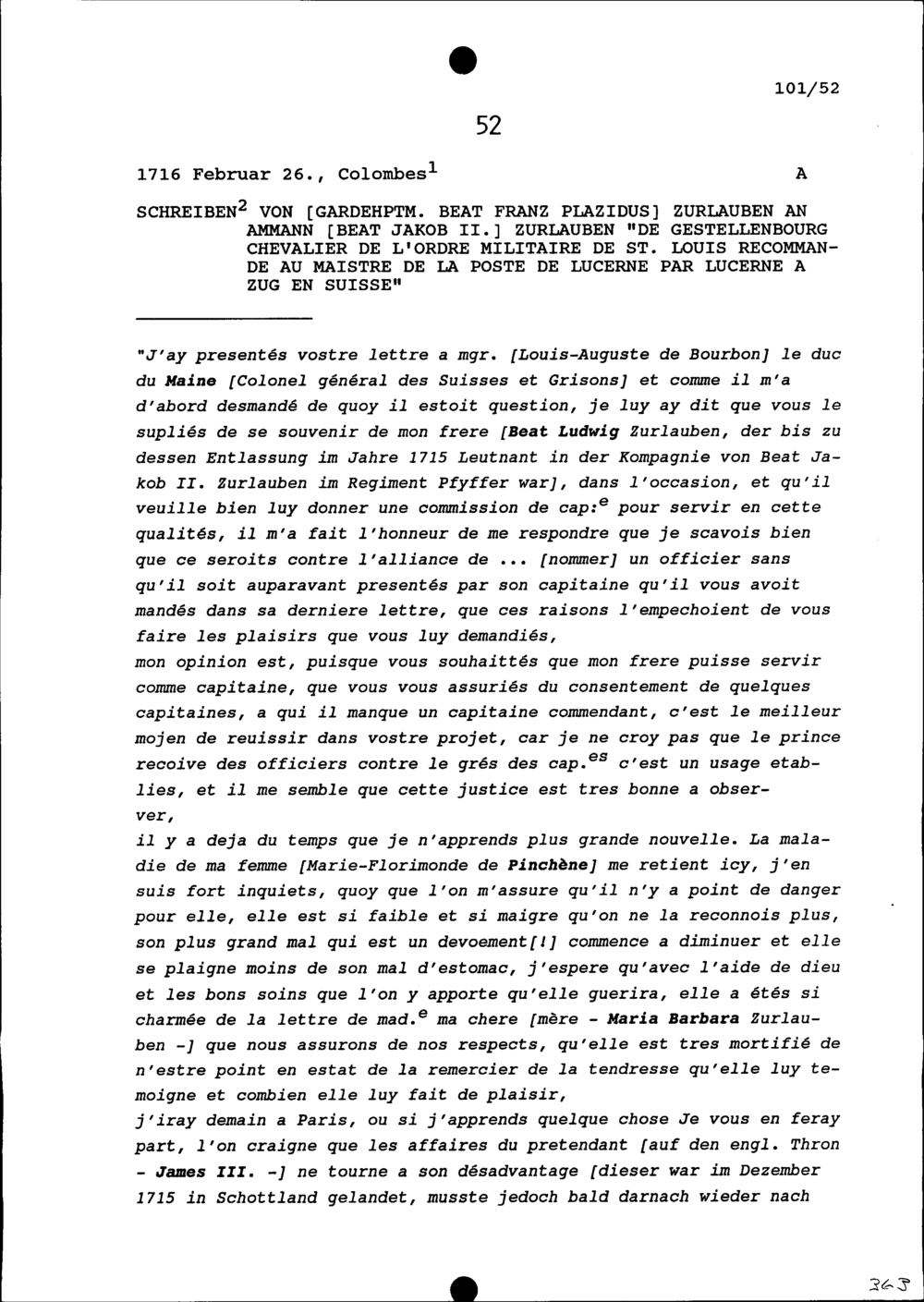 Schreiben von Beat Franz Plazidus Zurlauben, Gardehauptmann, an Beat Jakob II. Zurlauben,...
