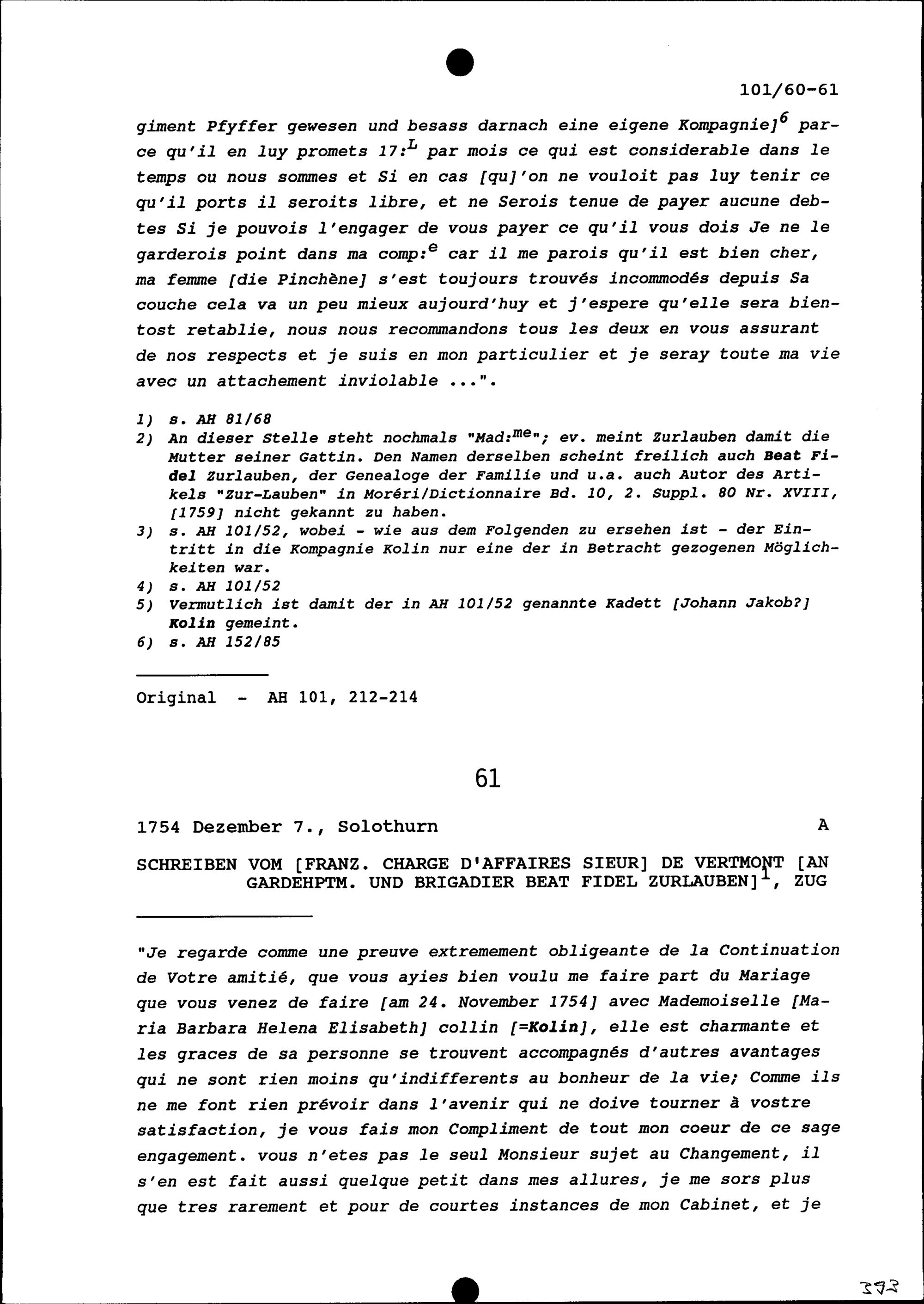Schreiben von Sieur de Vertmont, französischer Geschäftsträger, an Beat Fidel Zurlauben, Gardehauptmann und Brigadier, Zug