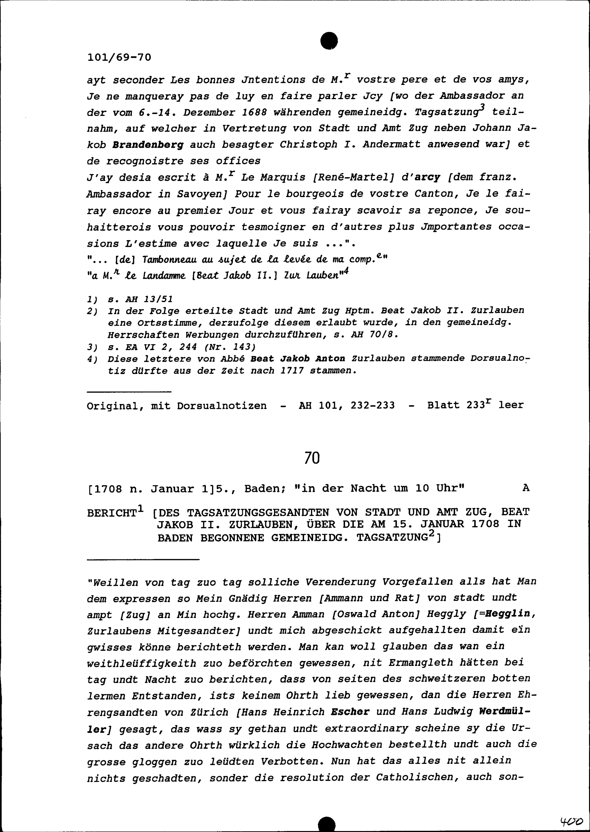 Bericht von Beat Jakob II. Zurlauben, Tagsatzungsgesandter von Stadt und Amt Zug, über die am 15. Januar 1708 in Baden begonnene Tagsatzung