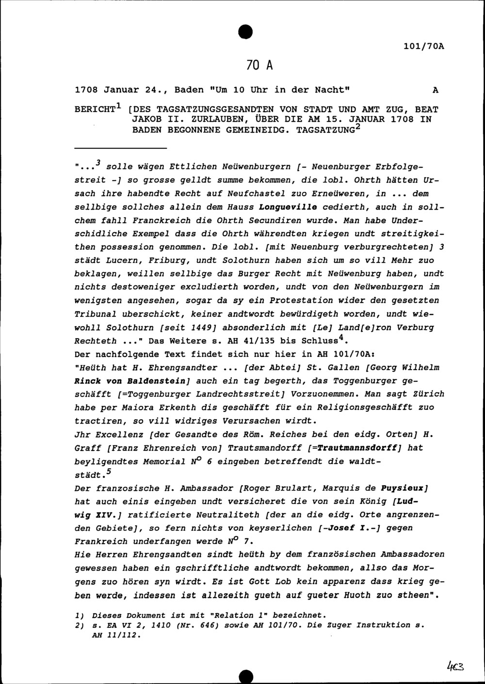 Bericht von Beat Jakob II. Zurlauben, Tagsatzungsgesandter von Stadt und Amt Zug, über die am 15. Januar 1708 in Baden begonnene Tagsatzung
