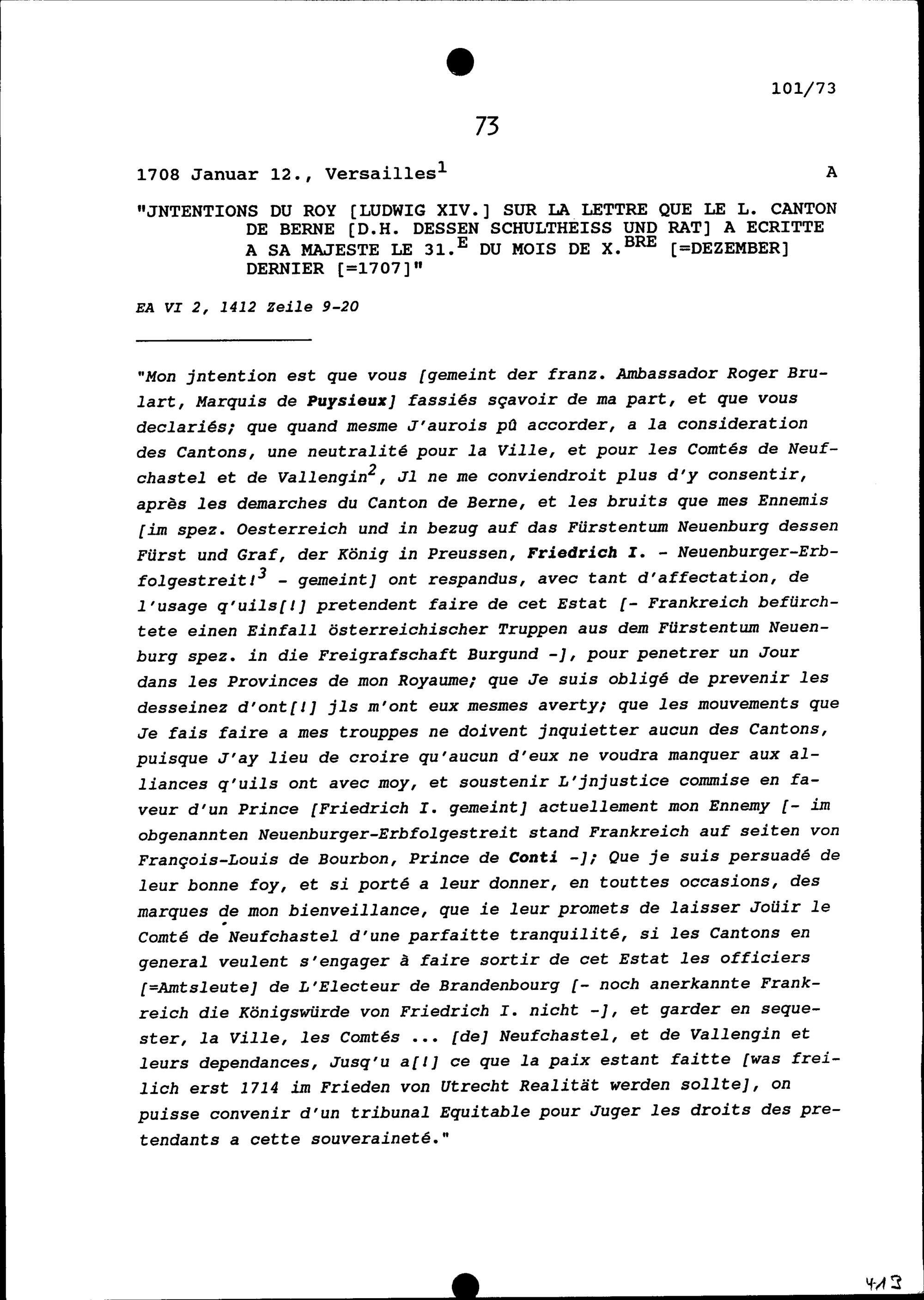 Antwort von Ludwig XIV., König von Frankreich, auf ein Schreiben von Bern
