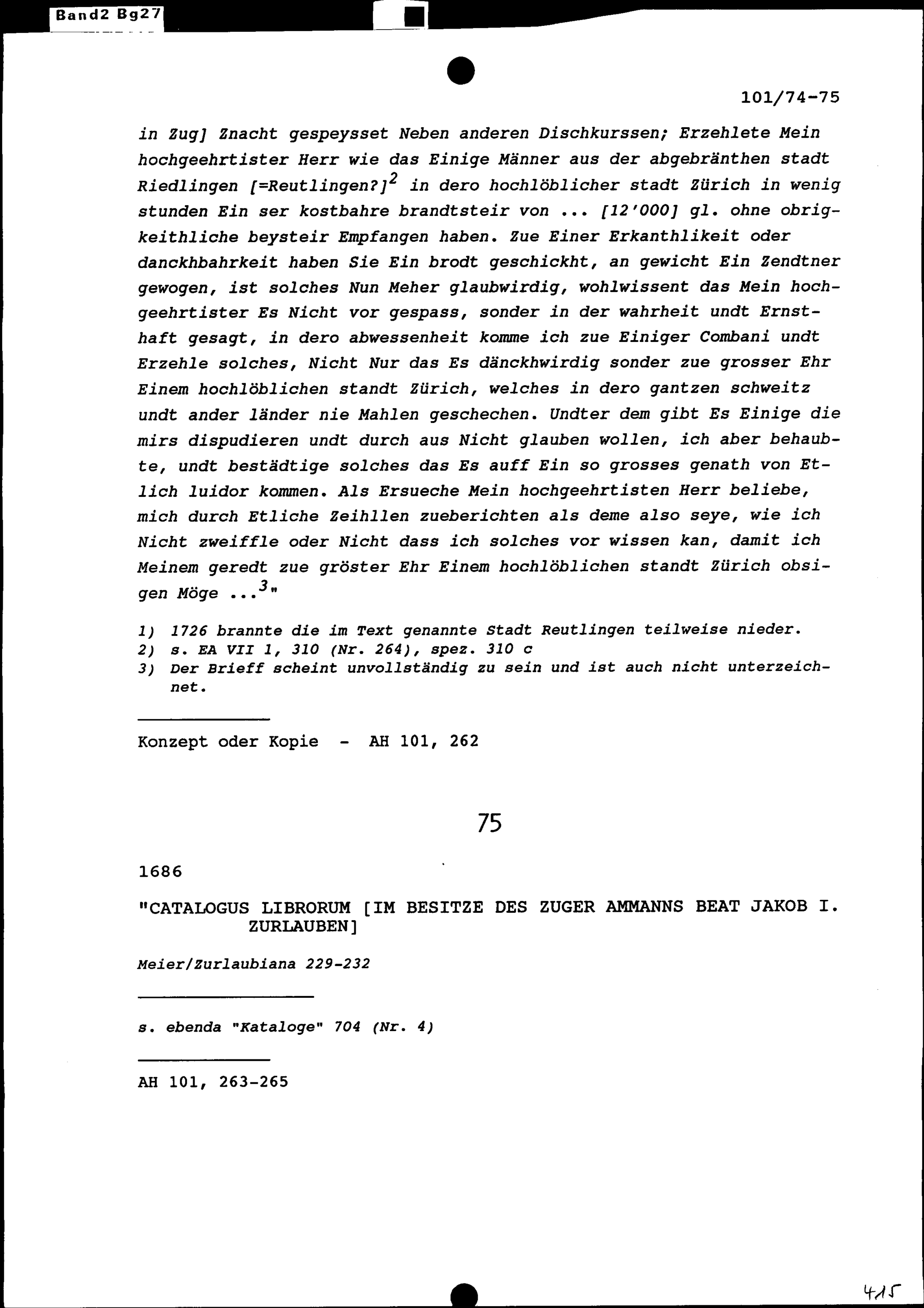 Bücherverzeichnis der Bibliothek der Zurlauben im Besitz von Beat Jakob I. Zurlauben, Ammann