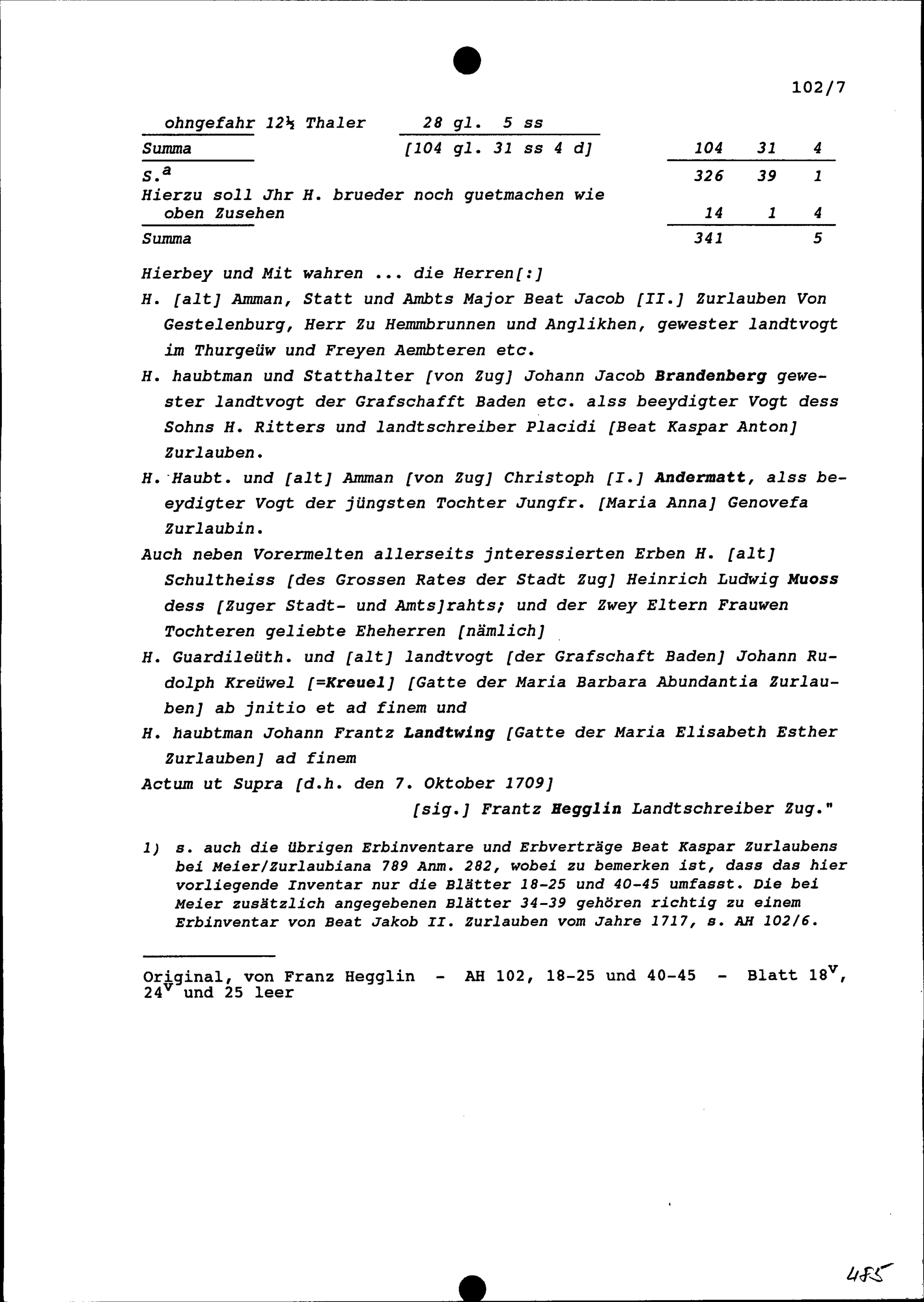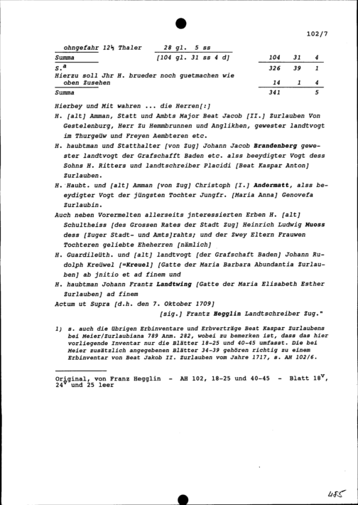 Inventar der Hinterlassenschaft von Beat Kaspar Zurlauben