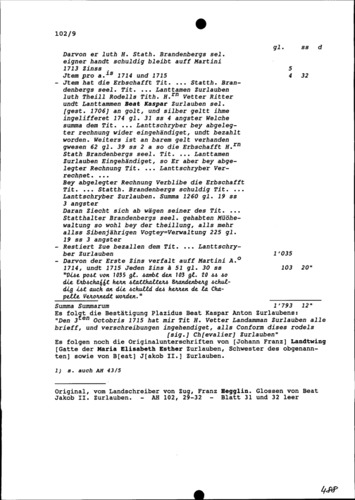 Abrechnung von Beat Jakob II. Zurlauben, Vormund von Plazidus Beat Kaspar Anton Zurlauben, sein Neffe