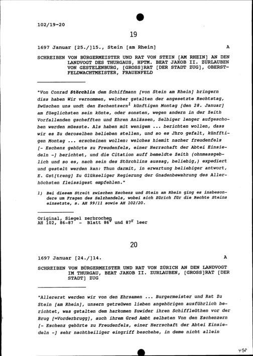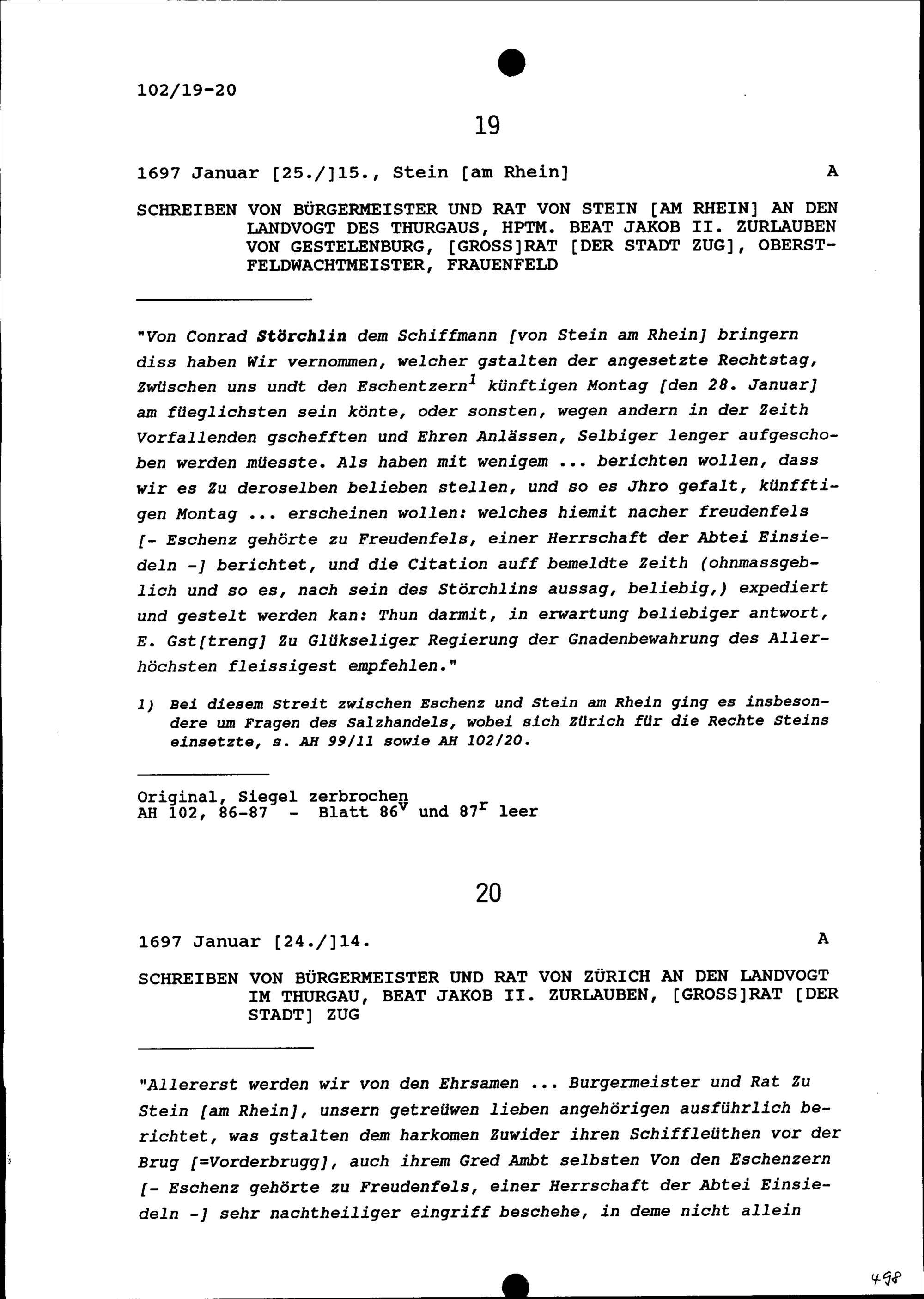 Schreiben des Bürgermeisters und Rats von Stein am Rhein an Beat Jakob II. Zurlauben,...