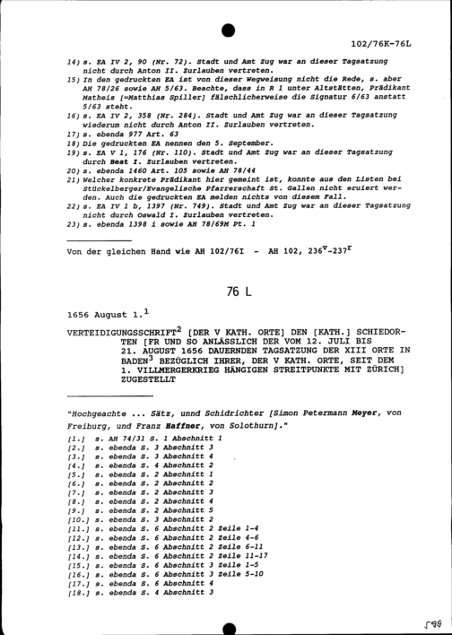 Verteidigungsschrift der Fünf Katholischen Orte bezüglich ihrer, seit dem Ersten Villmergerkrieg hängigen Streitpunkte mit Zürich zugestellt