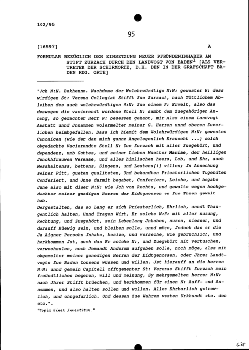 Formular bezüglich der Einsetzung neuer Pfrundinhaber am Stift Zurzach durch den Landvogt von Baden als Vertreter der Schirmorte