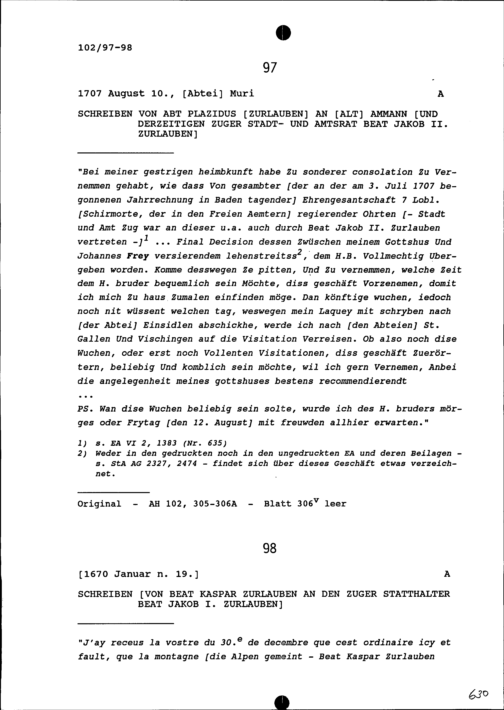Schreiben von Plazidus Zurlauben, Abt, an Beat Jakob II. Zurlauben, Altammann und Stadt- und Amtrat Zug