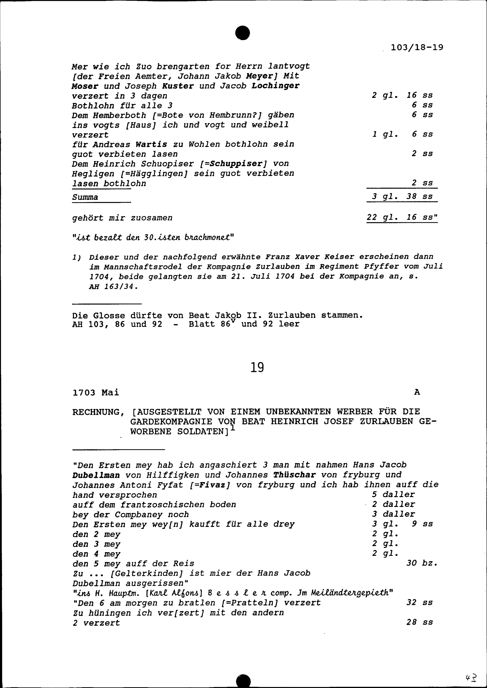 Rechnung für die Gardekompanie von Beat Heinrich Josef Zurlauben, ausgestellt von einem Werber