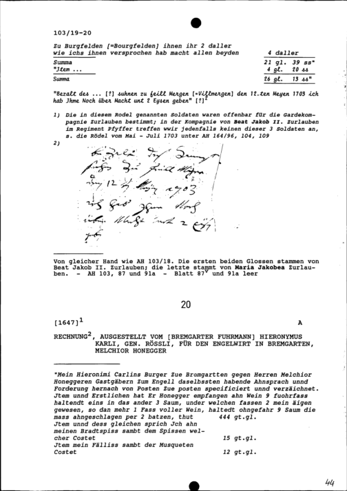 Rechnung für Melchior Honegger, Engelwirt, Bremgarten, ausgestellt von Hieronymus...