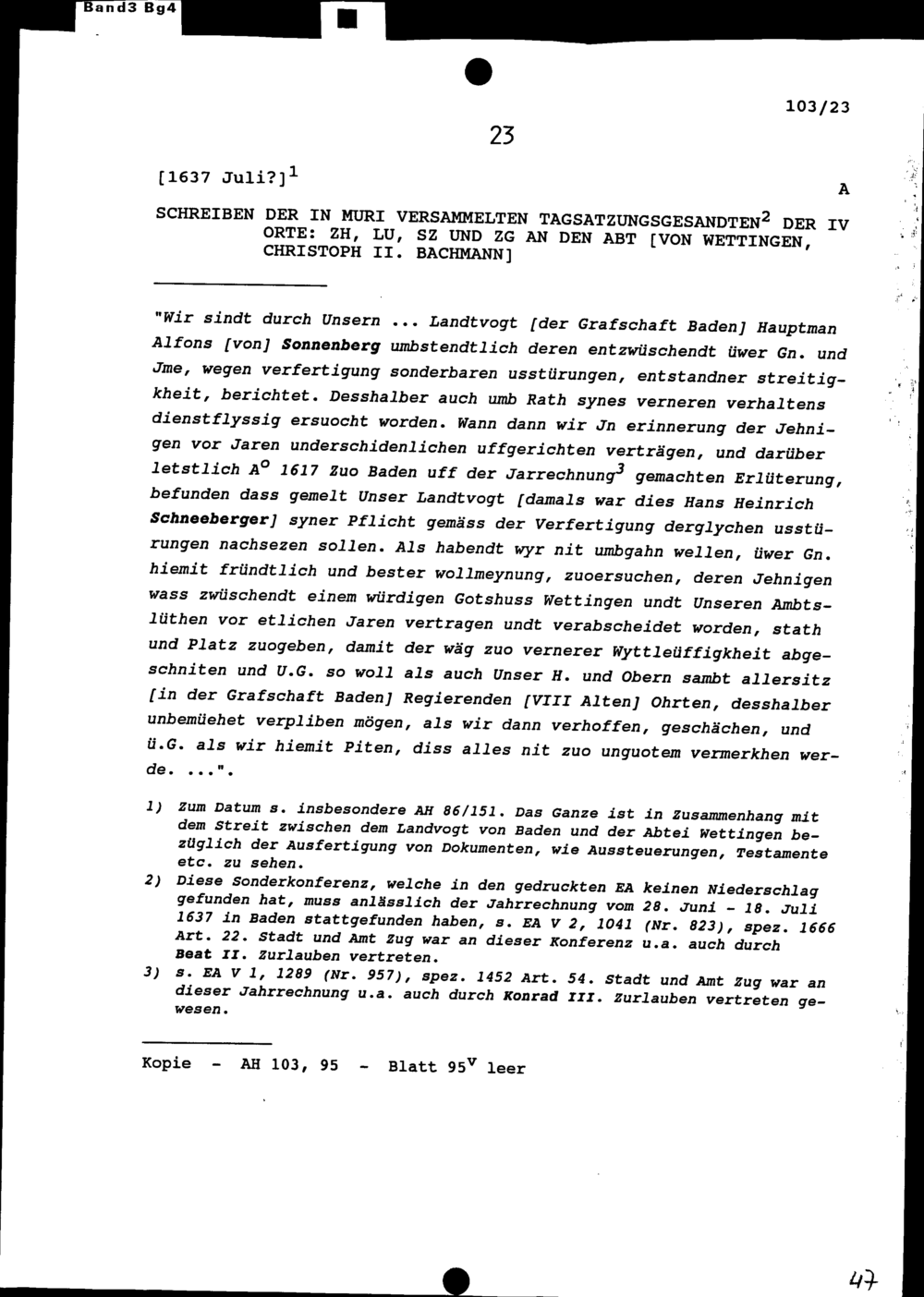 Schreiben der Tagsatzungsgesandten in Muri der Vier Orte Zürich, Luzern, Schwyz und Zug an Christoph II. Bachmann, Abt von Wettingen