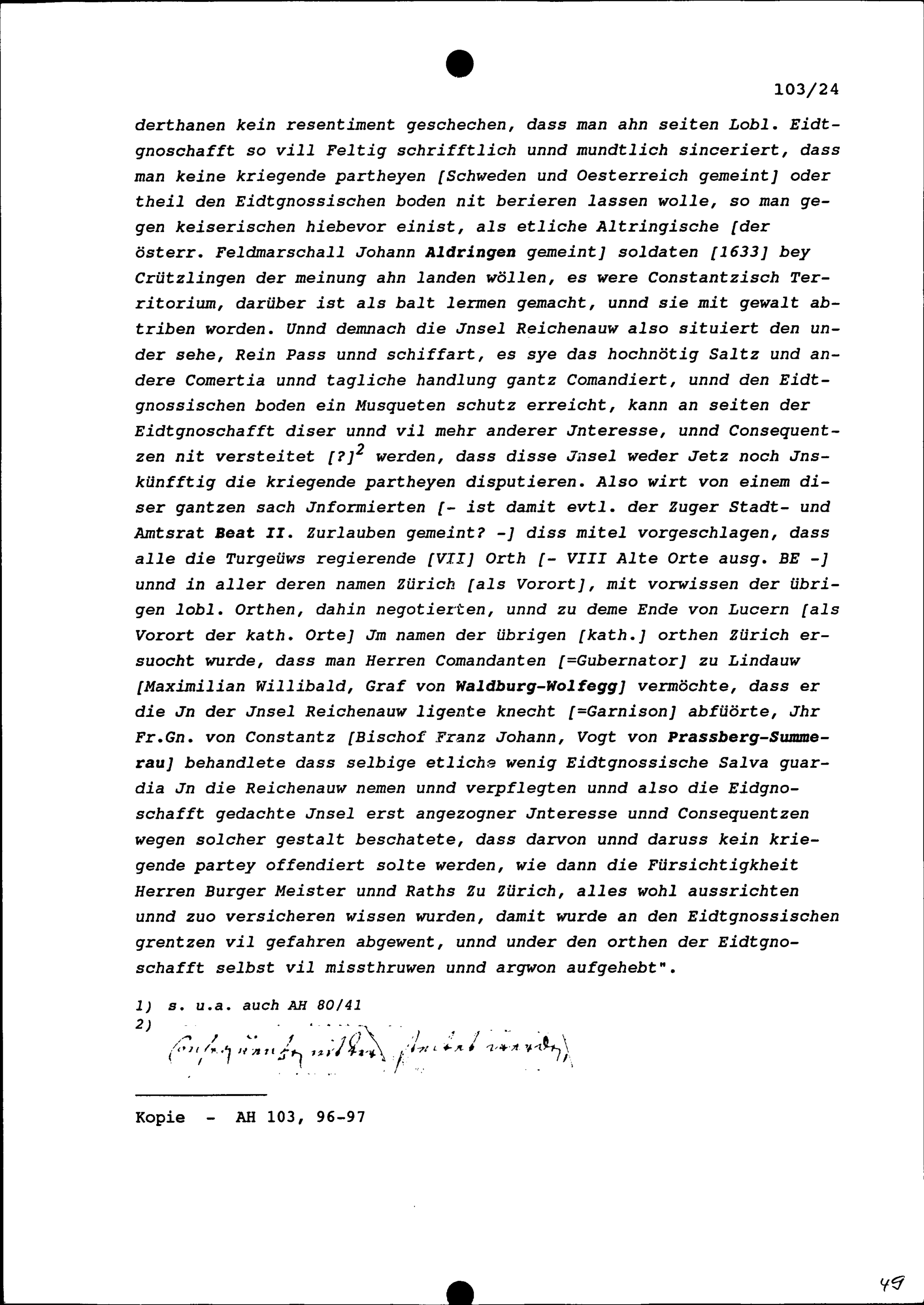 Bericht über den Überfall auf die Reichenau durch Konrad Wiederhold, in französischen Diensten stehender Kommandant der Festung Hohentwiel