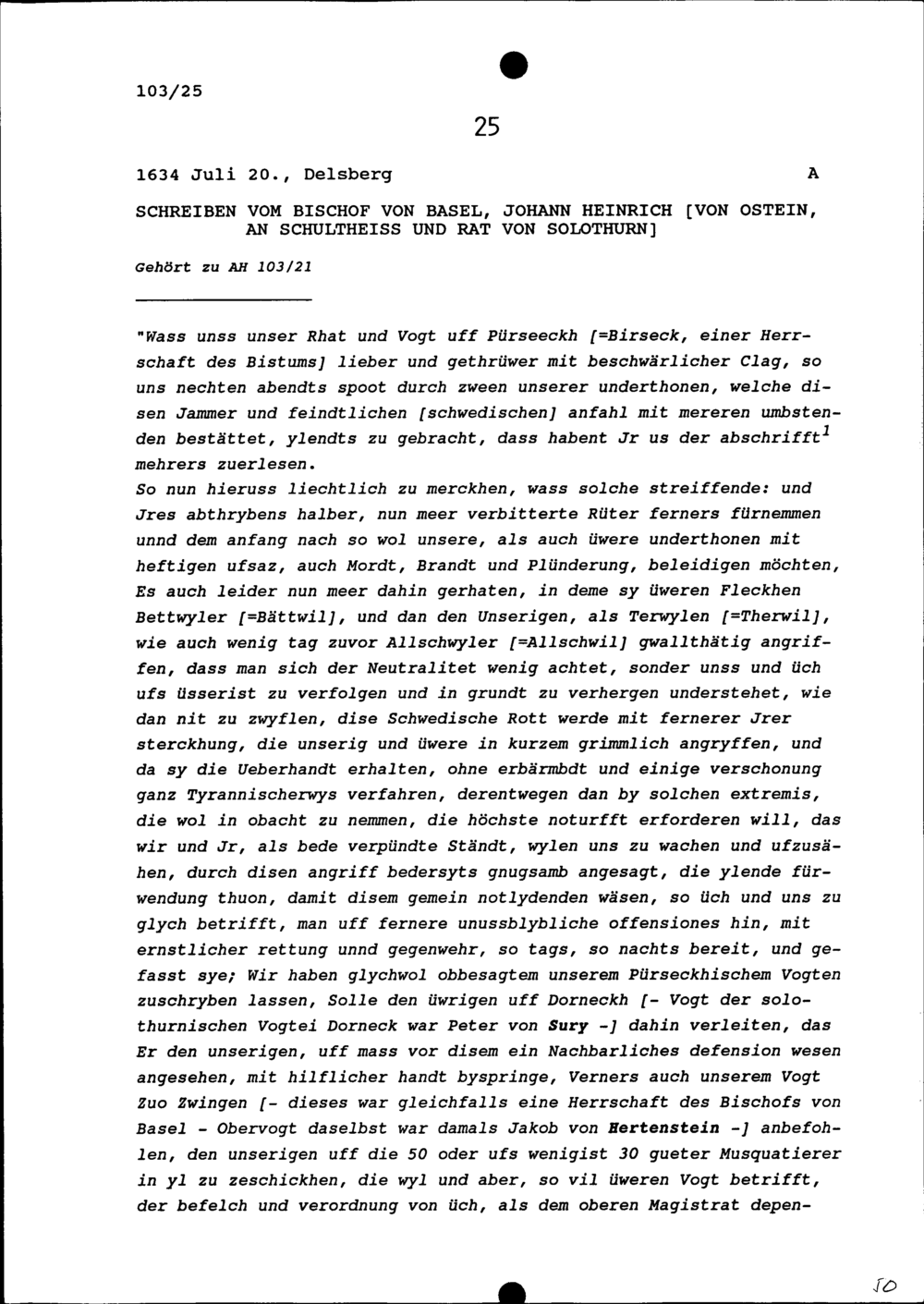 Schreiben von Johann Heinrich von Ostein, Bischof von Basel, an Schultheiss und Rat...