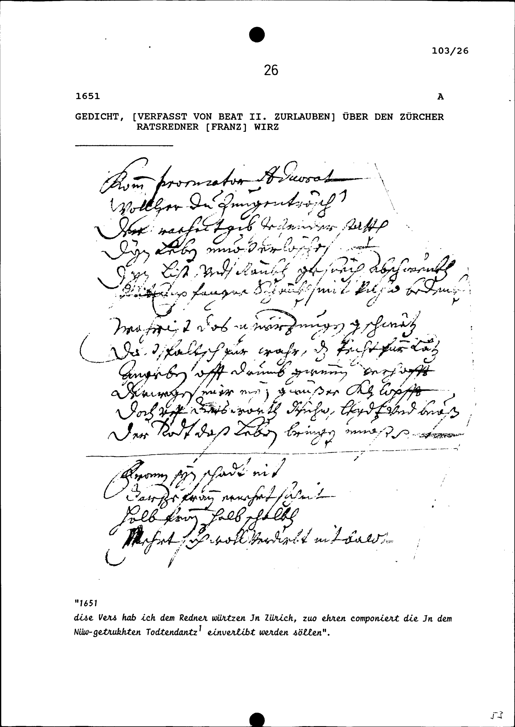 Gedicht, verfasst von Beat II. Zurlauben über Franz Wirz, Zürcher Ratsredner