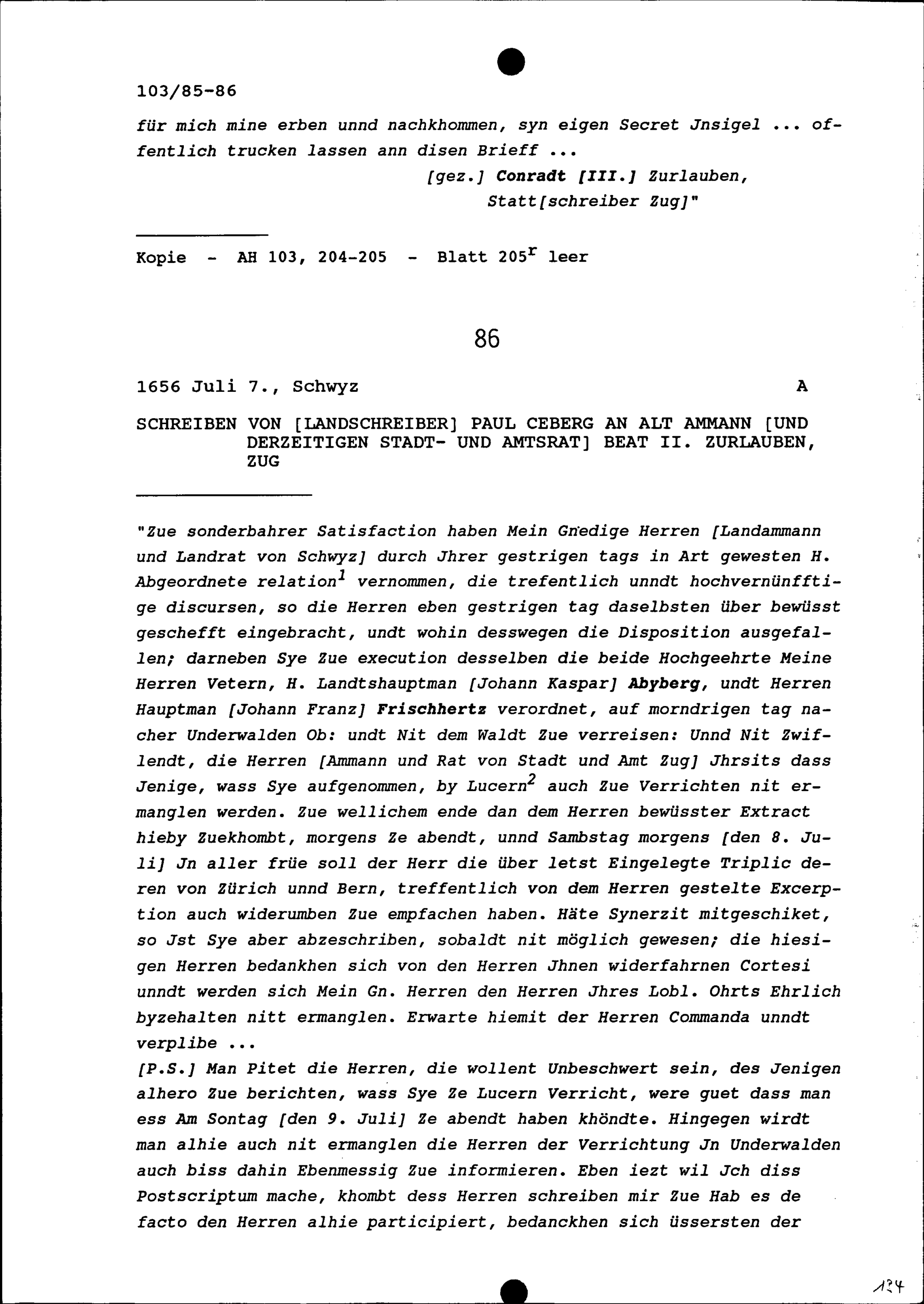 Schreiben von Paul Ceberg, Landschreiber, an Beat II. Zurlauben, Altammann und Stadt- und Amtrat, Zug