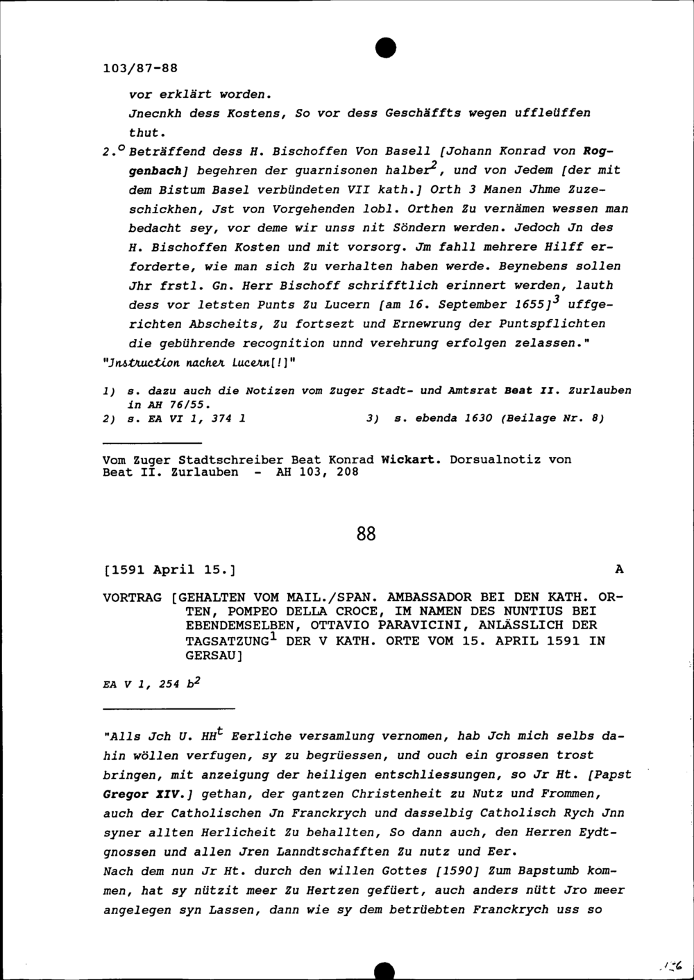 Vortrag gehalten von Pompeo della Croce, Ambassador von Mailand-Spanien bei den Katholischen Orten, im Namen von Ottavio Paravicini, Nuntius, anlässlich der Tagsatzung der Fünf Katholischen Orte vom 15. April 1591 in Gersau