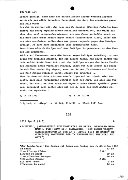 Rechnung für Beat II. Zurlauben, Zuger Tagsatzungsgesandter an der am 3. April 1633 in Baden begonnenen Konferenz der im Thurgau und Rheintal regierenden Orte, ausgestellt von Bernhard Wegmann, Engelwirt in Baden
