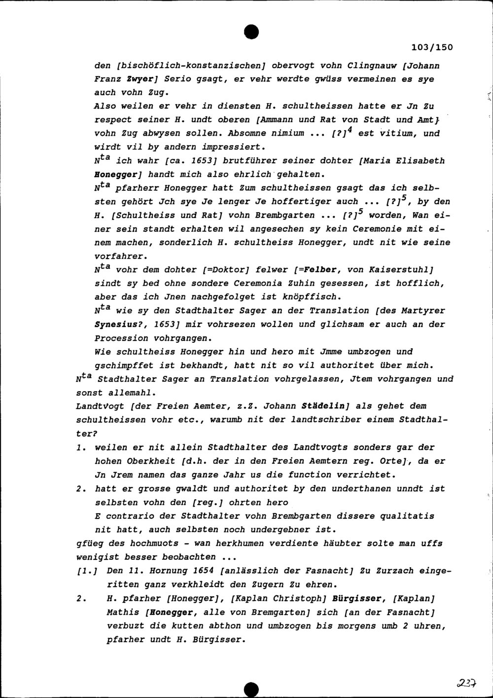 Notiz von Beat Jakob I. Zurlauben, Landschreiber der Freien Ämter, über seine Streitigkeiten mit Johann Heinrich Honegger, Pfarrer von Bremgarten