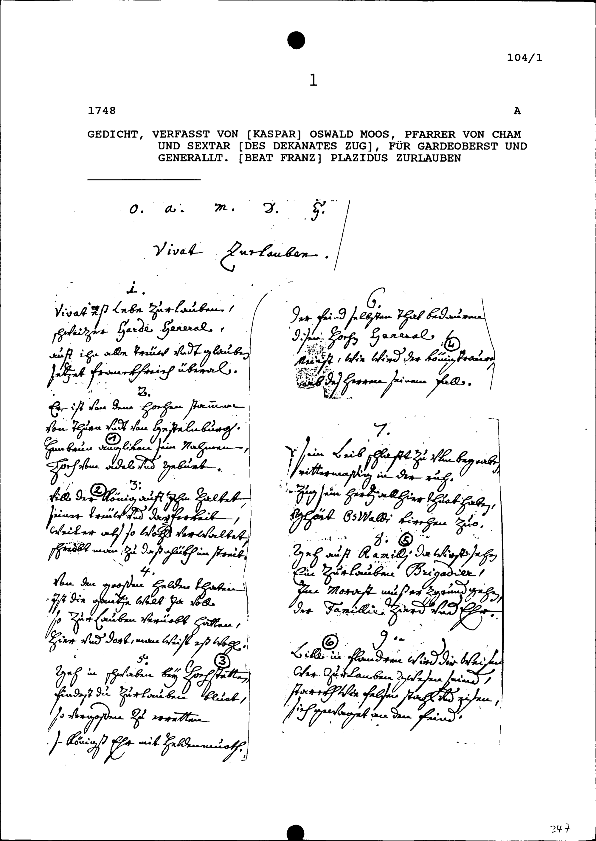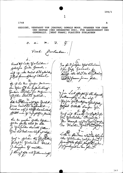 Gedicht, verfasst von Kaspar Oswald Moos, Pfarrer von Cham und Sextar des Dekanats Zug, auf Beat Franz Plazidus Zurlauben, Gardeoberst und Generalleutnant
