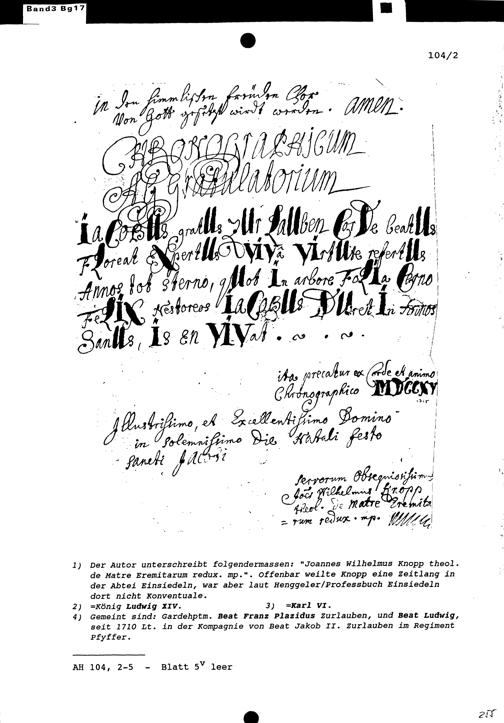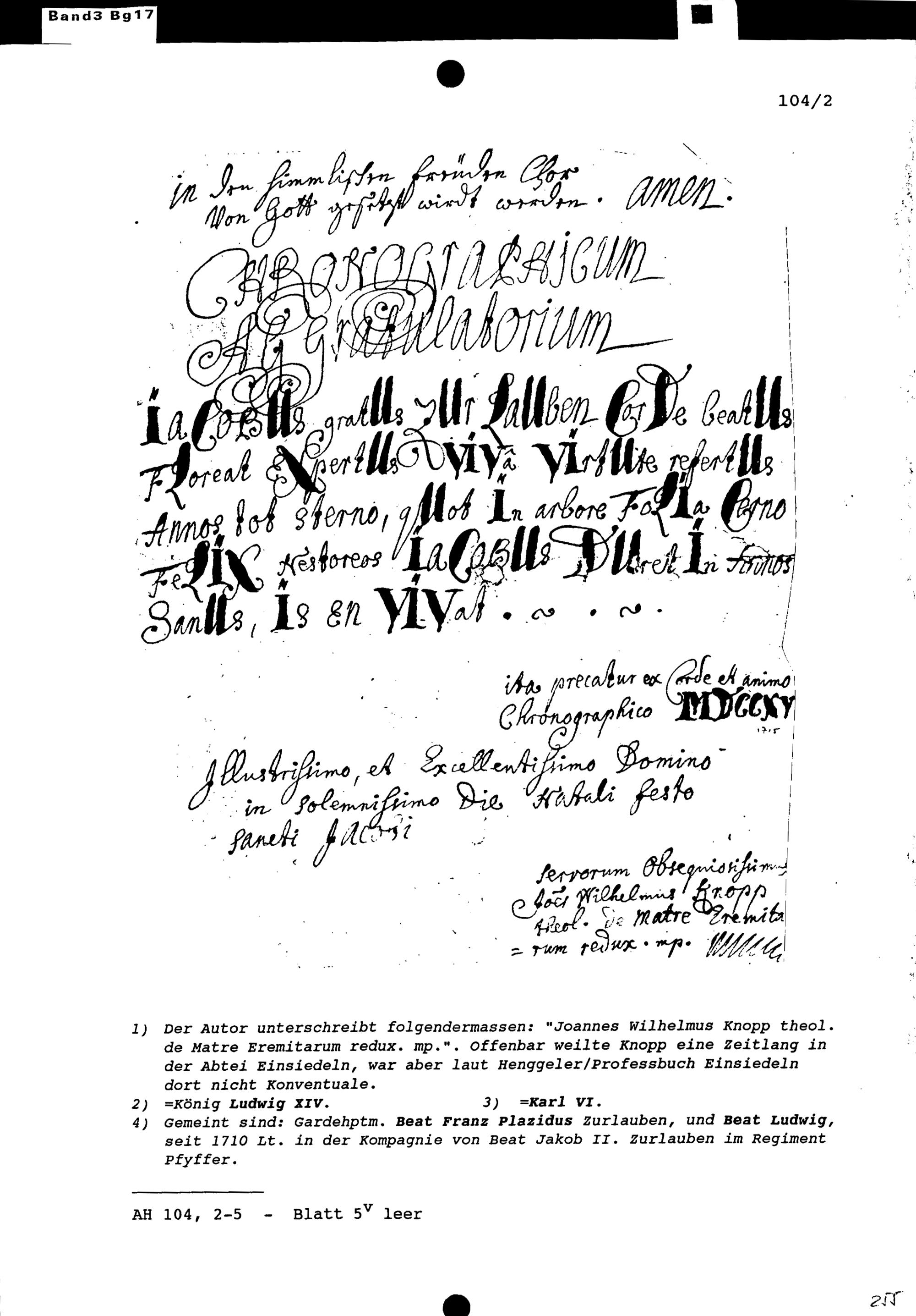 Gedichte in Form eines Anagramms, verfasst von Johann Wilhelm Knopp zu Ehren von Beat Jakob II. Zurlauben, Ammann von Stadt und Amt Zug