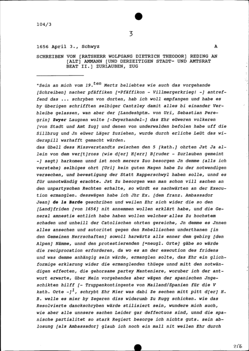 Schreiben von Wolfgang Dietrich Theodor Reding, Ratsherr, an Beat II. Zurlauben,...