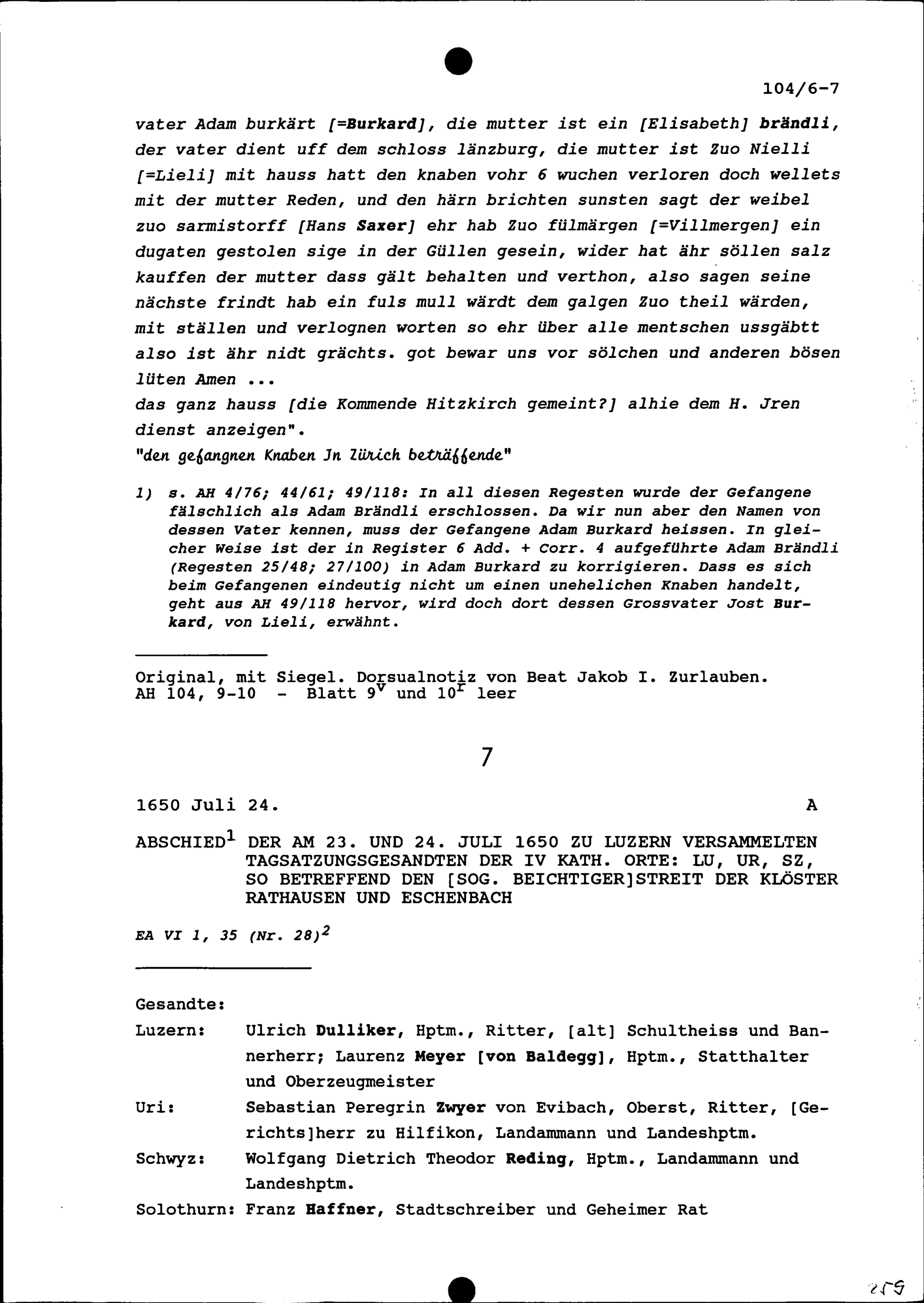 Abschied der Tagsatzung der Vier Katholischen Orte Luzern, Uri, Schwyz und Solothurn in Luzern betreffend den Beichtigerstreit der Klöster Rathausen und Eschenbach