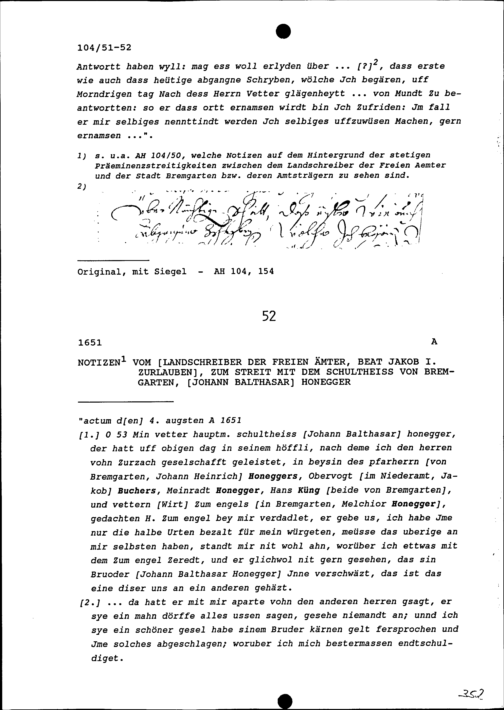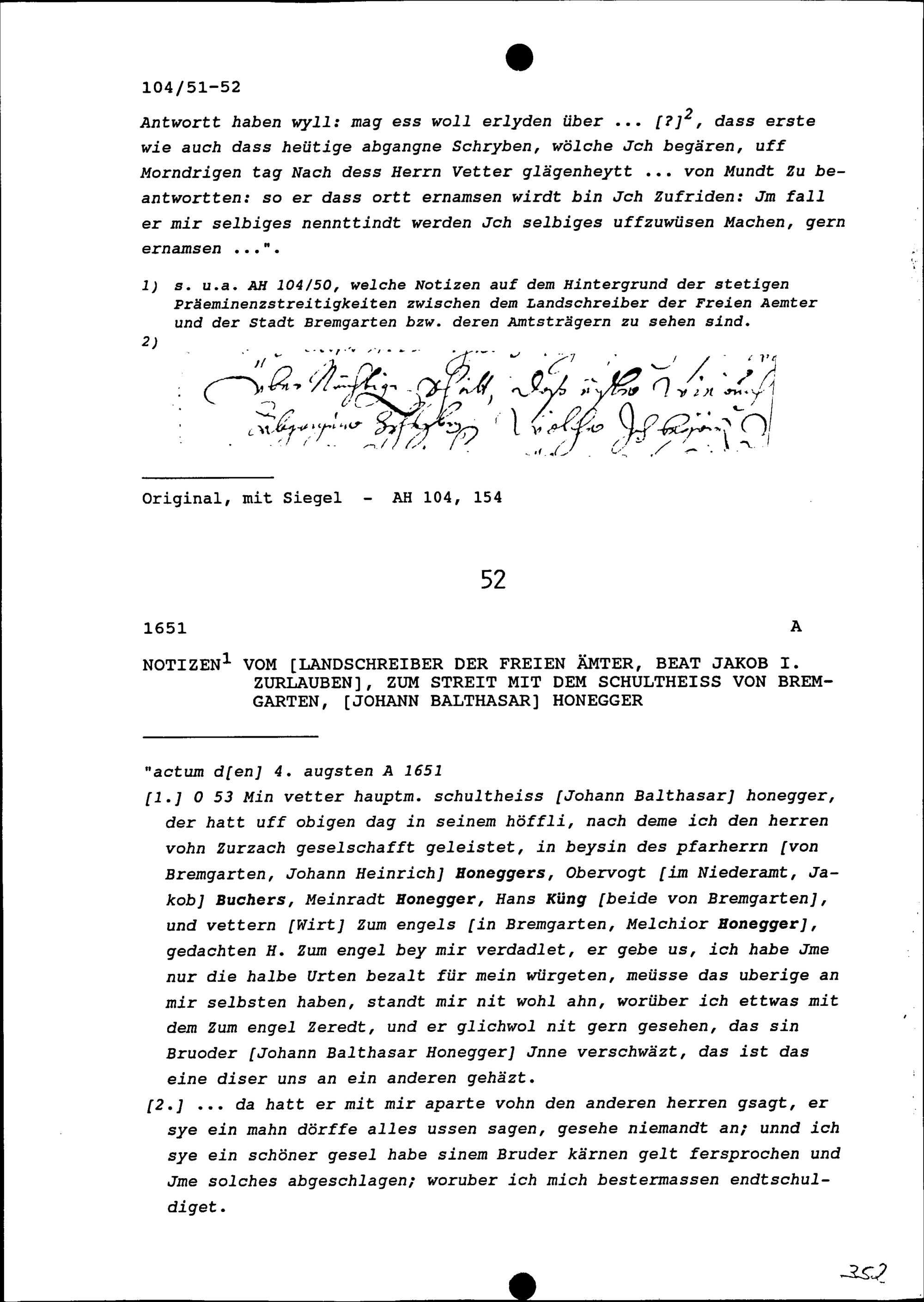 Notiz von Beat Jakob I. Zurlauben, Landschreiber der Freien Ämter, zum Streit mit Johann Balthasar Honegger, Schultheiss von Bremgarten